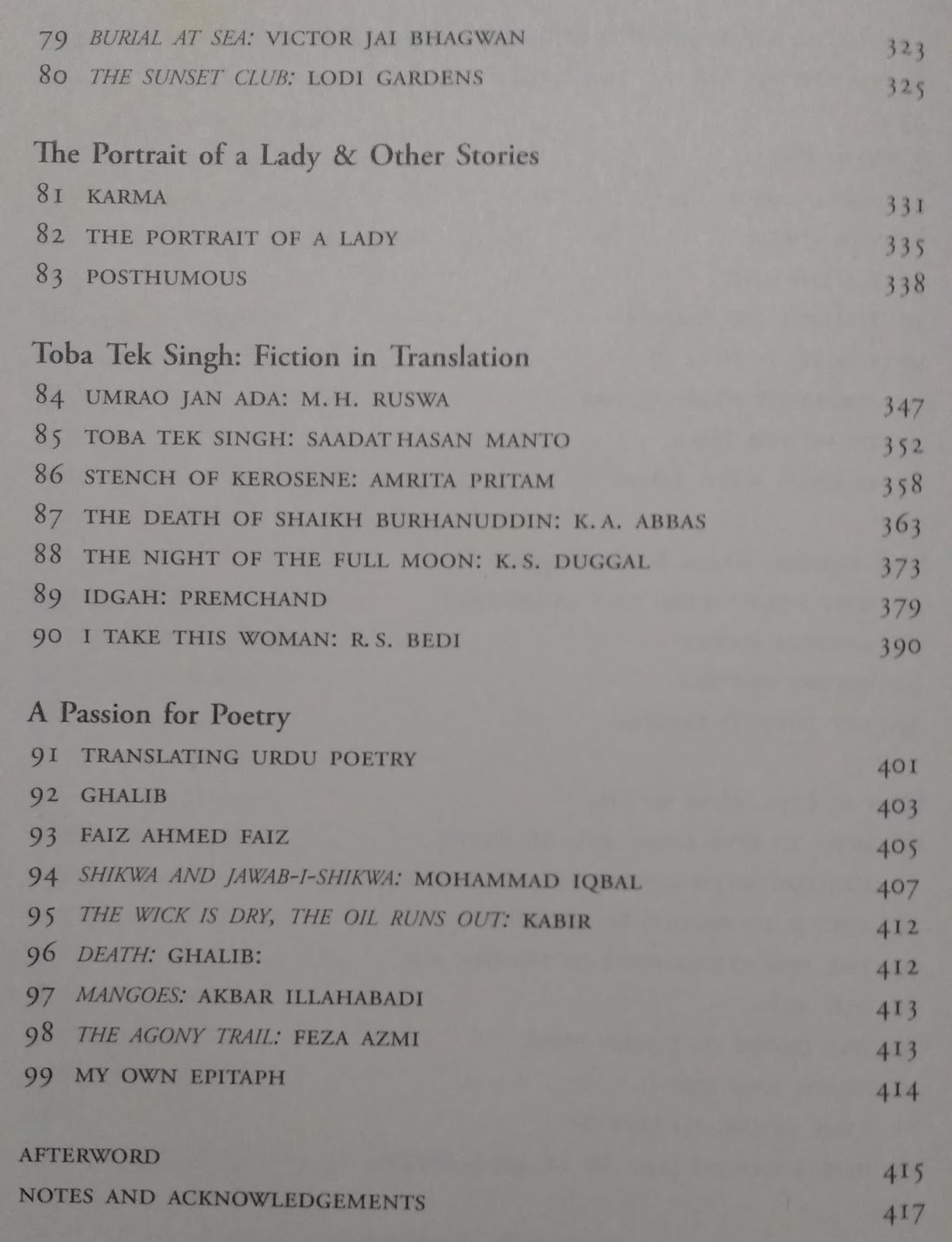 खुशवंतसिंग या प्रथितयश इंग्रजी लेखकांच्या 99 निवडक साहित्यकृतींचा हा संपादित संग्रह आहे.अनुक्रमणिकेवरून पुस्तकाच्या मजकुराची तुम्हाला कल्पना येईल.