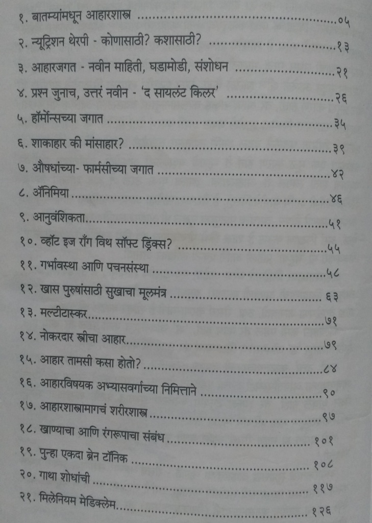 “खाल तसे व्हाल”, “खाल तसे दिसाल”, “अन्न हे पूर्णब्रह्म” ही आपल्या नेहमीच्या बोलण्यातली वाक्यं. चौरस आहाराचं महत्त्व आपण शाळेत असल्यापासून शिकतो. माहीत असतं तरीही कळतं पण वळत नाही अशी अवस्था आपली असते. कदाचित “अजून” कळलं तर आपण “वळायला” लागू या उद्देशानेच हे पुस्तक वाचलं पाहिजे.