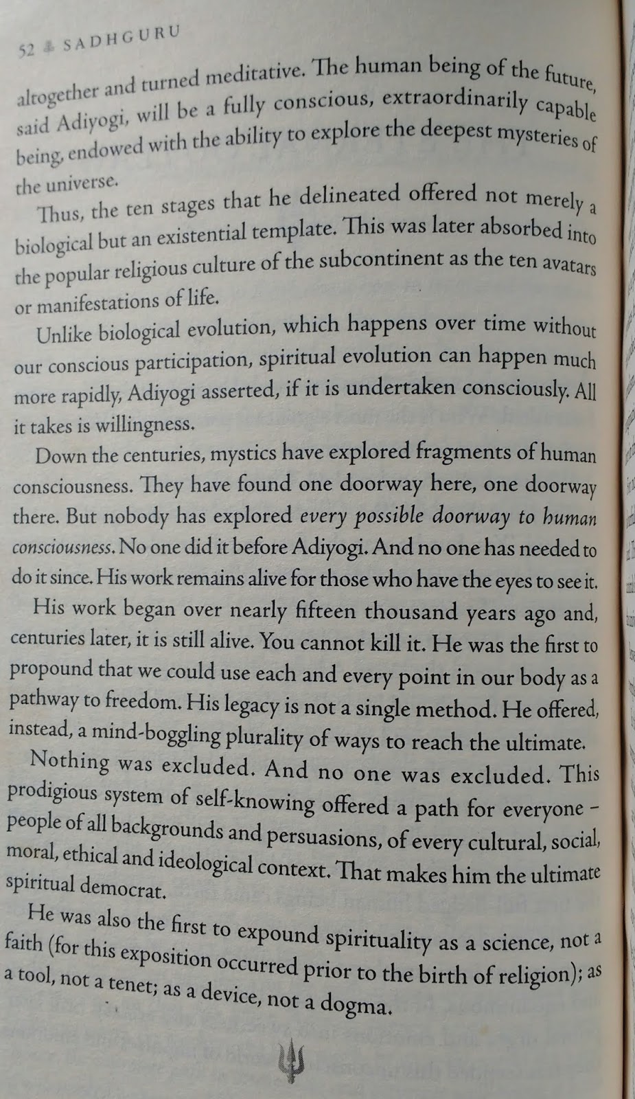 दक्षिणेतल्या एका मुलीचे आदियोगी वर प्रेम बसले. तिच्या बरोबर लग्नासाठी आदियोगी दक्षिणेला निघाला. त्या मुलीच्या घरच्यांना हे मान्य नव्हतं. म्हणून त्यांनी छलकपट करून हे लग्न होऊन दिलं नाही. ती मुलगी कुमारीच राहिली. तीच देवी कन्याकुमारी. अशी आख्यायिका दिली आहे. पण इतक्या सामर्थ्यशाली आदियोग्याला हे छलकपट का समजू नये. बरं आधी नाही समजलं तरी जेव्हा लक्षात आलं तेव्हा त्याने जाऊन मुलीची समजूत का नाही काढली. घरच्यांना शिक्षा का नाही केली? एकदा “आदियोग्याला’ माणूस म्हटलं की हे माणसांसारखी वर्तणूक अपेक्षित नाही का ? पण सद्गुरूंनी त्यांच्या कल्पना सांगाव्यात आणि आपण त्या फक्त ऐकाव्यात अशी पुस्तकाची धारणा असावी.