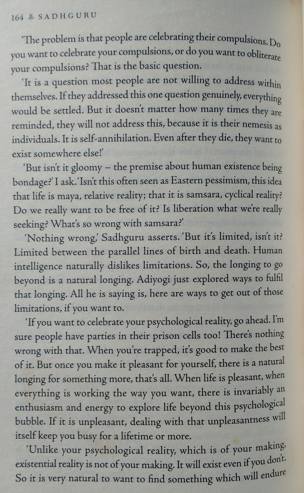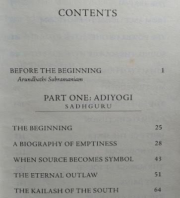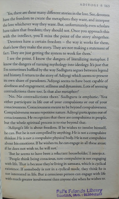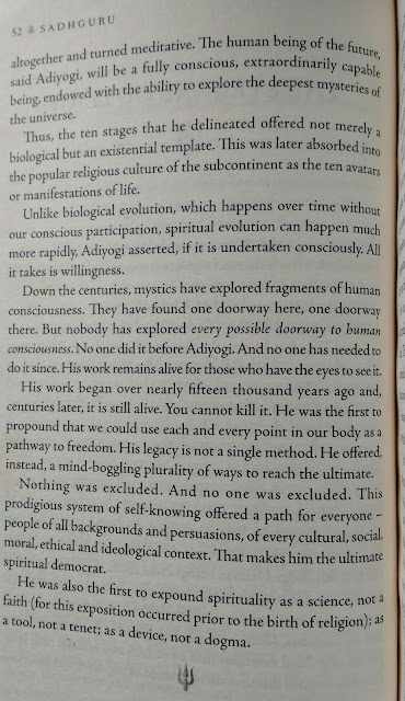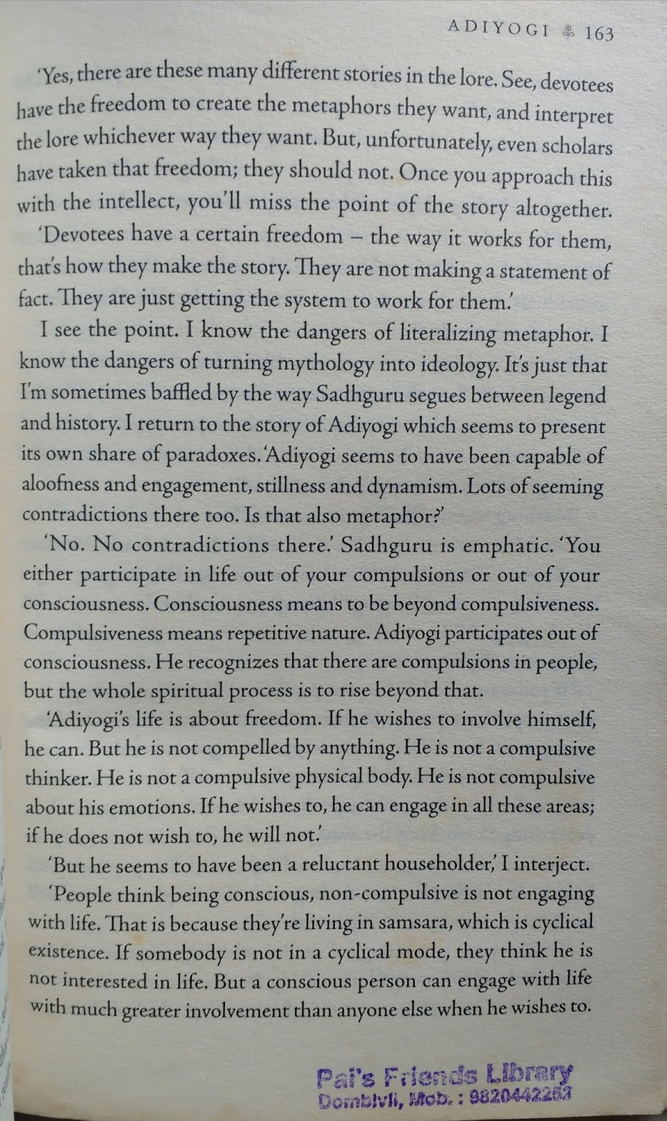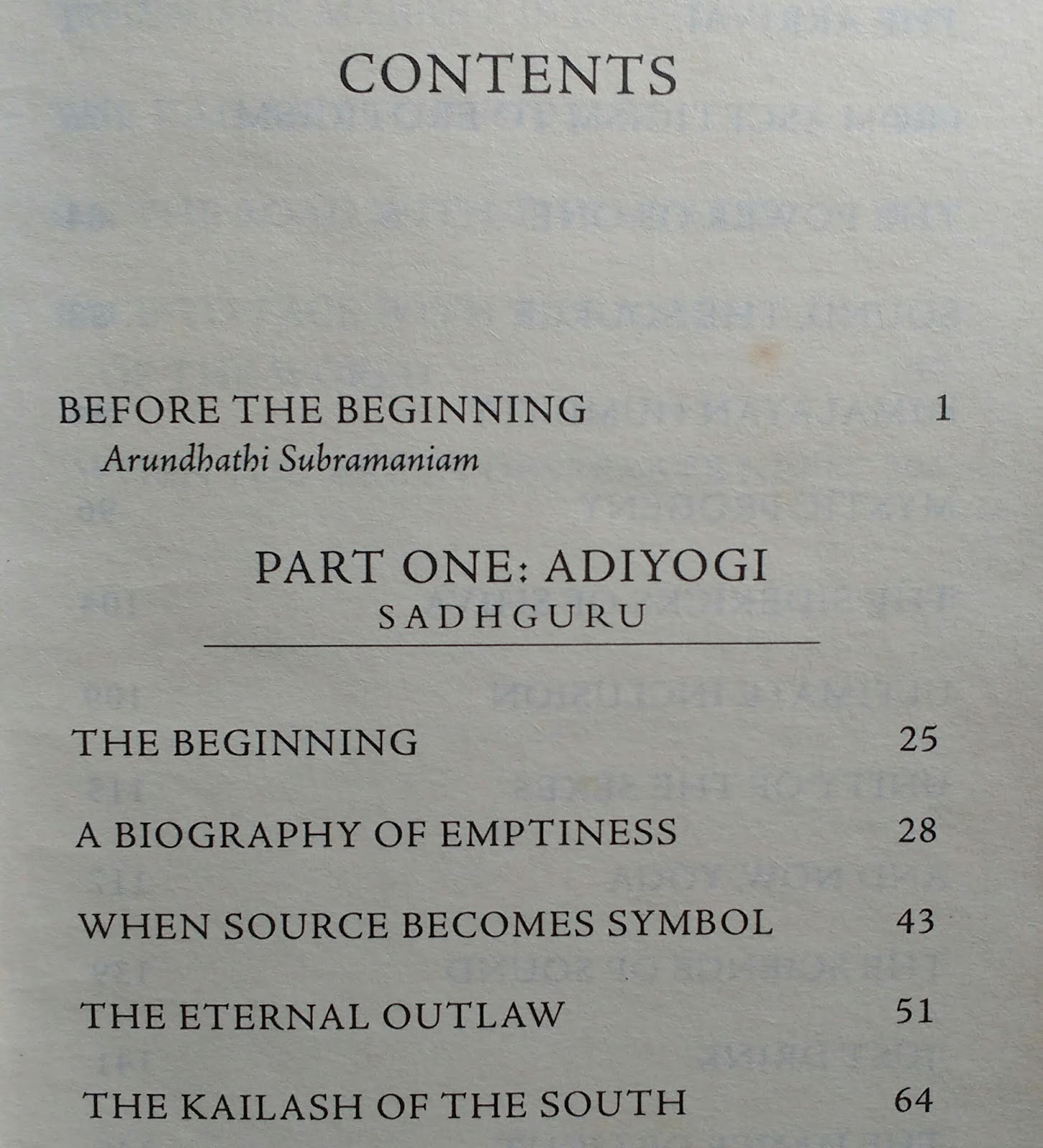 पण एकूणच हे पुस्तक खूप गोंधळलेले आहे. आदियोगी हा परमेश्वर नाही तर माणूस होता हे मान्य करण्यासाठी पुरावे काय? १५ हजार वर्षेंच कशावरून ? प्रजापतीचा यज्ञ आणि सतीचे यज्ञात उडी घेणं ही कथा सांगताना, यज्ञ हे भारतात वाढणाऱ्या नव्या आर्य संस्कृतीचं प्रतीक तर शंकर हे अनार्य लोकांच दैवत असा ओझरता उल्लेख केलाय. हे कशावरून? त्याच कथेत आधी जेव्हा लोक ब्रह्मा-विष्णू या देवांची आराधना करतात ते देव आर्य की अनार्य? आणि लोकांना देव असे भेटत होते का? याचे काही उत्तर नाही.