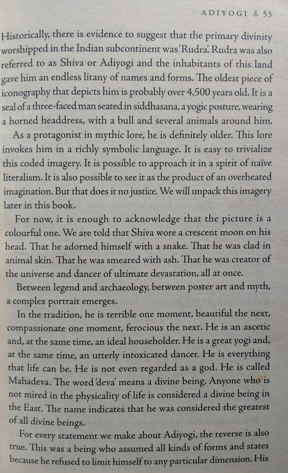 वेद, उपनिषदे, पुराणे आणि रामायण-महाभारतासारख्या ग्रंथातून भारतीय संस्कृतीचे, तत्वज्ञानाचे मार्गदर्शन आणि संवर्धन हजारो वर्षे झाले आहे. पुराणात हजारो गोष्टी आहेत, नानविध चमत्कार आहेत, रूपक कथा आहेत ज्या आपल्यापर्यंत परंपरेने कौटुंबिक वारसा म्हणून पोचतात. या कथा चमत्कार खरंच घडले का ? घडले तर कधी ? का त्या फक्त काल्पनिक कथा आहेत ? का ती फक्त रूपके आहेत ज्यामुळे केलेला उपदेश लक्षात ठेवायला सोपा जाईल? या कथांचे नाना मते मांडता येतील. असेच मत “सद्गुरू” यांनी या कथांमधल्या “महादेव शंकर” या भारतीय देवतेबद्दल मांडले आहे. त्यांच्या मते सुमारे पंधरा हजार वर्षांपूर्वी कैलासात एक प्रत्यक्ष मानव अवतरला. ज्याने ध्यान-धारणा-योग यांचा शोध लावला आणि त्याचा जगात प्रसार केला. म्हणून तो पहिला योगी “आदियोगी” गणला जातो. उदा.