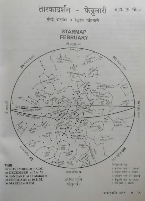 ५-६ जानेवारीला डोंबिवलीत झालेल्या विज्ञान संमेलनात मी खगोल अभ्यासक, पंचांगकर्ते दा.कृ. सोमण यांची “आकाशदर्शन २०१९” ही पुस्तिका विकत घेतली. ५० रुपयांची आहे. हौशी आकाश निरीक्षकांसाठी माहिती देणारी ही पुस्तिका आहे. यात पुढील गोष्टींचा समावेश आहे.