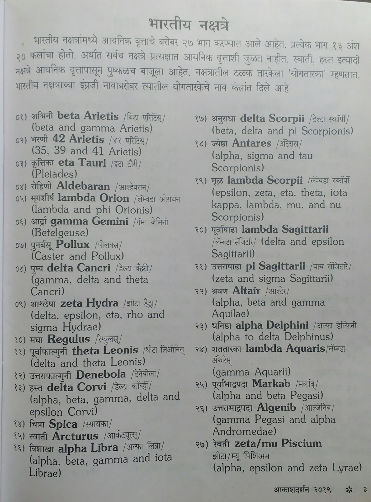 १) भारतीय नक्षत्रे – २७ नक्षत्रांची मराठी आणि इंग्रजी नावे