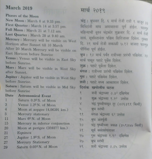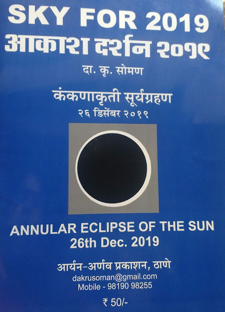 ५-६ जानेवारीला डोंबिवलीत झालेल्या विज्ञान संमेलनात मी खगोल अभ्यासक, पंचांगकर्ते दा.कृ. सोमण यांची “आकाशदर्शन २०१९” ही पुस्तिका विकत घेतली. ५० रुपयांची आहे. हौशी आकाश निरीक्षकांसाठी माहिती देणारी ही पुस्तिका आहे. यात पुढील गोष्टींचा समावेश आहे.