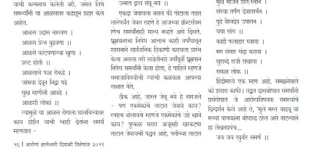 बहुतेक लेख लठ्ठपणा, मधुमेह, चुकीची जीवनशैली यावरचे आहेत त्यामुळे माहितीची फार पुनरावृत्ती झाली आहे असं वाटतं. अजून वेगळ्या विषयांवरचे लेखन घेता आले असते तर अंकाची उपयुक्तता वाढली असती. पण बहुतांश आजारांचे मूळ कारण याच गोष्टी असल्यामुळे त्यांच्यावरच लक्ष केंद्रित करावे असा विचार संपादकांचा असावा.