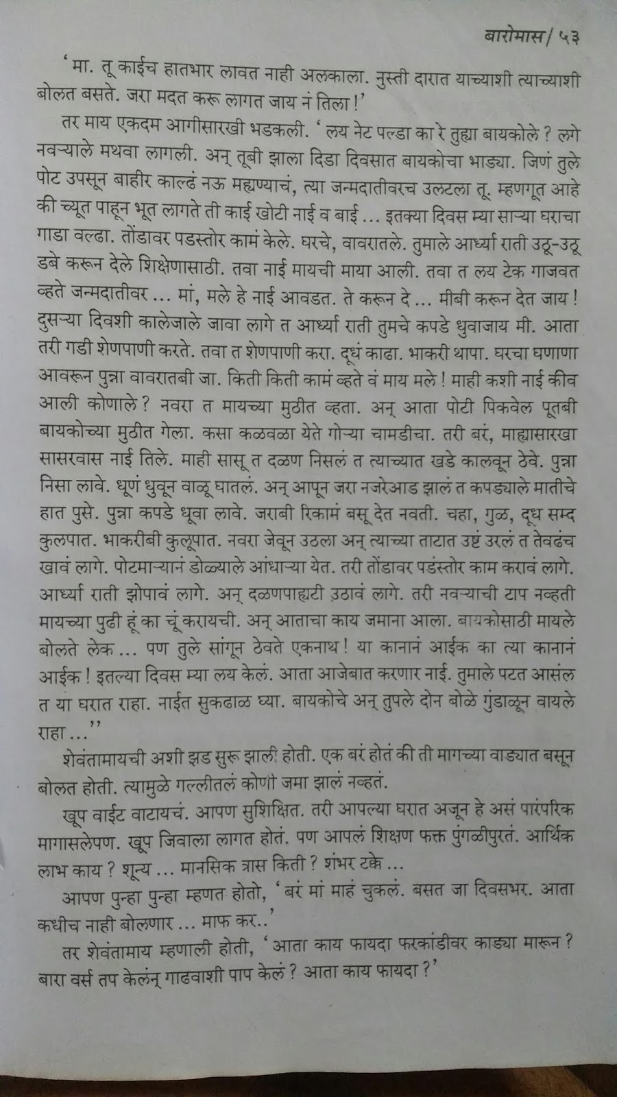 खरं म्हणजे दाहक प्रश्न मांडणारं इतकं करूण पुस्तक वाचल्यावर त्या मूळ प्रश्नानेच आपण इतके विचाराधीन होतो की लेखकाची लेखनशैली, मांडणी वगैरे चर्चा खूप तकलादू वाटतात. पण मग लक्षात येतं की हे वास्तव इतक्या प्रभावीपणे आपल्या मनात रुजतंय याचं कारण लेखकाची शैली आणि मांडणी आहे. त्यामुळे त्याबद्दल थोडं बोललंच पाहिजे. पुस्तकात निवेदक प्रमाण भाषेत बोलतोय तर सगळी पात्र उत्तर महाराष्ट्र-विदर्भाच्या मधल्या पट्ट्यातली अस्सल ग्रामीण बोली बोलतायत. शिकलेल्या एकनाथला लागलेली प्रमाण मराठीची सवय सोडून तो पुन्हा गावरान बोलीकडे वळतो; पुस्तकं वाचायची हौस हळूहळू मागे पडते यातून मनानेही शेतकरी कसा हवालदिल होतो आहे ही मानसिक तगमग्सुद्धा जाणवते. एकनाथची आई कष्ट करणाऱ्या पिढीची प्रतिनिधी. मुलांनी प्रगती करावी म्हणून हाडाची काडं करणारी पण अपेक्षाभंगामुळे उद्ध्वस्त झालेली, नवी सून – शहरातून आलेली – आपल्यासारखी नांदत नाही म्हणून फटकळ पणाने बोलणारी. तिचा त्रागासुद्धा पटतो. तिच्या तोंडातून बाहेर पडणाऱ्या म्हणी, असभ्य वाक्प्रचार यातून तिच्या बोल्णायाला येणारी धार हा भाषेच्या द्रुष्टीने वाचायला मजेशीर भाग आहे. एकनाथचा भाऊ उनाडक्या करत, पटकन पैसा मिळवणऱ्या मार्गात जाऊन बापाला घोर लावतो. परिस्थिती एकच पण तिचा परिणाम आणि तिला प्रतिसाद हा प्रत्येकाच्या पिंडनुसार कसा टोकाचा वेगळा असू शकतो हे दाखवणारी उत्तम पात्रे रंगवली आहेत.