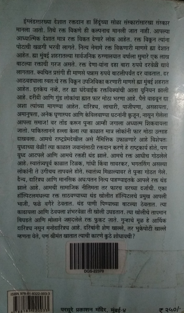 लीलाबाईंचा नाईलाजच आहे, आपल्या गोजिरवाण्या नातीला खेळवताना औषधावाचून तडफडणारे नाती-नातू त्यांना दिसतात. ते स्मरण त्यांना केवळ सुखात रमू देत नाही. हादेखील एक रक्तदोषच आहे“