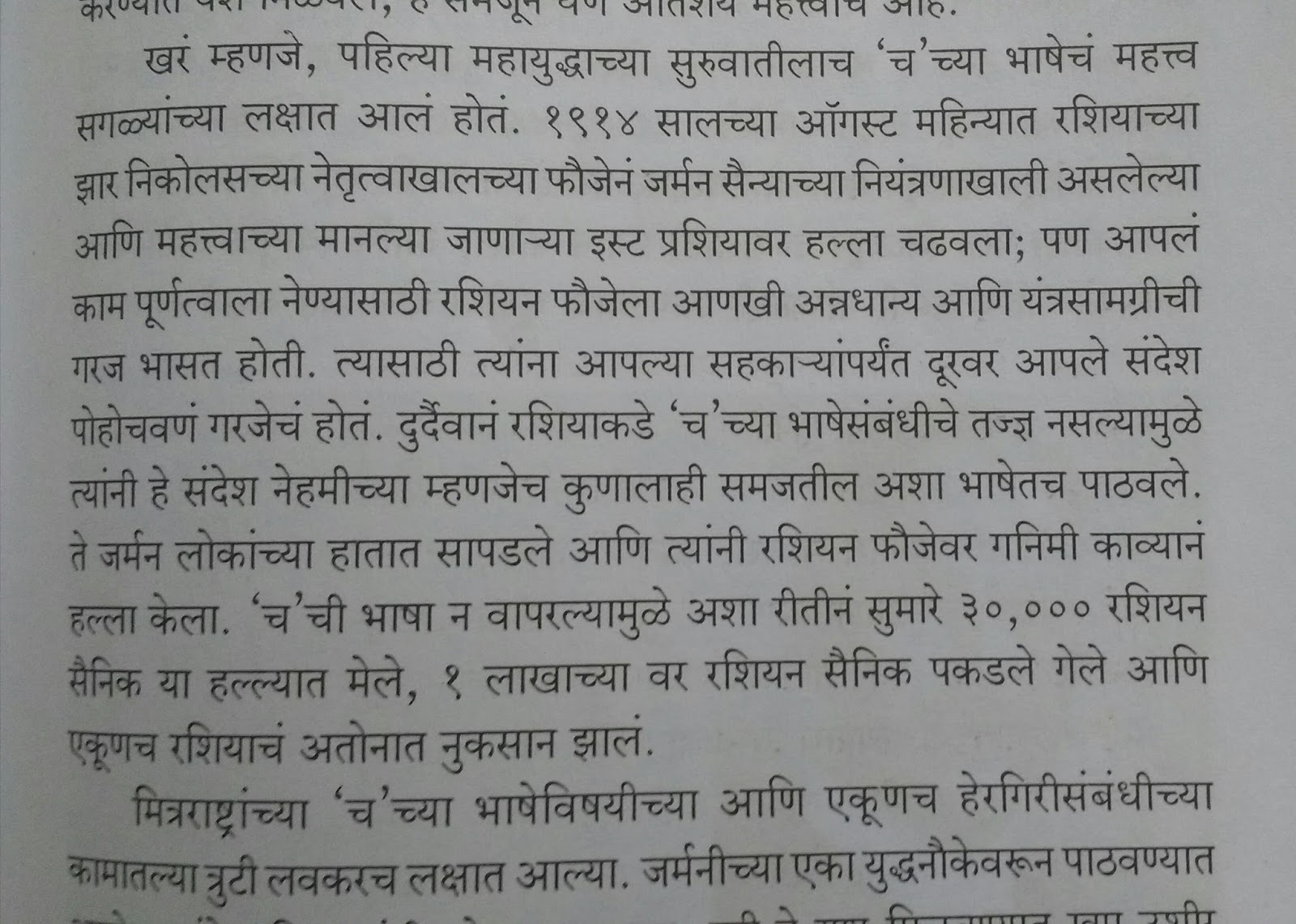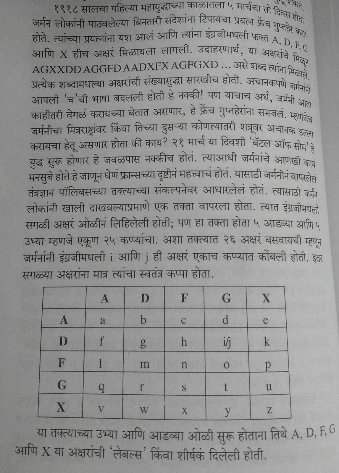 जवळपास तीनशे पानी पुस्तकात भारताबद्दल मात्र एकच परिच्छेद आहे. महाभारतात, जुन्या ग्रंथात हेरगिरीचा उल्लेख आहे; गुप्त संदेशवहनाला “गूढलेपक” म्हणायचे इतकाच उल्लेख आहे. बाकी अजिबात माहिती नाही. एका प्रकरणात भारतातून काही गुप्त संदेश येत होते असा उल्लेख आहे. पण ते कोण पाठवत होतं वगैरे माहिती नाही. ही बाब मला थोडी विचित्र वाटली. जुन्या ग्रीक, रोमन पुराणकाळातले उल्लेख लेखकाने दिले आहेत पण मौर्य, मगध, चोल या साम्राज्यांमध्ये असला प्रकार घडत असेलच ना ? मोगलाई, शिवाजी महाराज, पेशवाईच्या काळात हेरगिरी असणारच ना? शिवाजी महाराजांचे प्रसिद्ध गुप्तहेर बहीर्जी नाईक निरोप कसा पाठवत असतील? स्वातंत्र्यानंतर भारत-पाकिस्तान युद्धे झाली त्यात क्रिप्टोग्राफीचा वाटा असणारच ना? पण काहीच उल्लेख नाही. लेखकाने त्या दृष्टीने संशोधन केले नव्हते? का पाश्चिमात्यांप्रमाणे भारतीय लोक “डोक्युमेंटेशन” करत नसल्याने आज पुरावे उपलब्ध नाहीत? मी एका ठिकाणी असं वाचलेलं की “दोन मोत्ये गळाली, सत्तावीस मोहरा हरपल्या, सव्वा लाख बांगडी फुटली !!” हेही कव्यात्मक वर्णन नसून तेव्हा पाठवलेल्या पत्रातील सांकेतिक निरोप आहे. जुनी हस्तलिखितं, देशभरातली वाचनालयं आणि परदेशातील संग्रहालयं यातल्या कागदपत्रांत हा मजकूर मिळणार नाही का? महायुद्धांमध्ये घडलेल्या घटना आणि गूढ कामे यांची माहिती बऱ्याच वर्षांनी युरोपियन देशांनी हळूहळू उजेडात आणली तशी अजून भारत सरकारने केले नाहिये का ? आयटी क्षेत्र भारतात इतकं मोठं असताना सध्याच्या पिढी, भारतातल्या कंपन्यापण काहीच करत नाहियेत का? हे प्रश्न नक्कीच येतील. यांची उत्तरं लेखकच देऊ शकेल. कदाचित भारताच्या संदर्भात एक पूर्ण पुस्तकच कुणाला संशोधन करून लिहिता येईल.