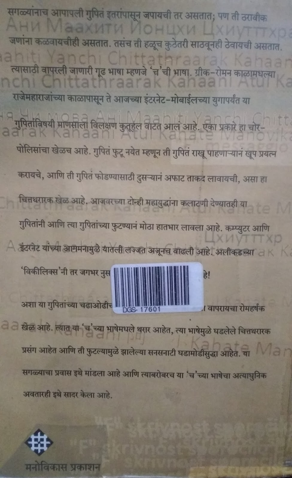आपण एकमेकांशी वेगवेगळ्या प्रकारे संवाद साधून आपल्या भावना आणि माहितीची देवाणघेवाण करतो. जेव्हा ही माहिती किंवा भावना खाजगी स्वरूपाची असते तेव्हा एकाने दुसऱ्याला सांगताना ते तिसऱ्याला कळू नये अशी अपेक्षा असते. मग आपण दुसऱ्याच्या कानात बोलतो, कोणी आजुबाजूला नसताना बोलतो, खाणाखुणा करून बोलतो किंवा सांकेतिक शब्दांत बोलतो. या सांकेतिक भाषेची तोंडओळख आपल्याला लहानपणी “च ची भाषा” हा गंमतीदार खेळ खेळताना होते. प्रत्येक शब्दाच्या सुरुवातीचे अक्षर शेवटी नेत आणि सुरुवातीला ’च’ म्हणत वाक्य बोललं जात. उदा. “मी तुला एक गंमत सांगतो” हे वाक्य “चमी चलातु चकए चंमतग चांगतोस” असं काहितरी बोललं जातं. दोन व्यक्तींच्या संवादाची जागा जर दोन देशांमधल्या, दोन सैनिकांच्या तुकडी मधल्या किंवा गुप्त प्रकल्पावर काम करणाऱ्या दोन संशोधकांच्या संवादाची कल्पना केली तर मात्र या ’च’ची भाषा काही पुरेशी गूढ नाही हे सांगायलाच नको. अशा अतिमहत्त्वाच्या, गुप्त माहितीच्या देवाणघेवाणीसाठी तिऱ्हाईताला कळणार नाही अशा गूढ प्रकारे निरोपांची देवाणघेवाण करणे म्हणजे “क्रिप्टोग्राफी”.”क्रिप्टोग्राफी” तंत्राचा रोमन,ग्रीक काळापासून ९० च्या दशकापर्यंतचा आलेख लेखकाने या पुस्तकात मांडला आहे.