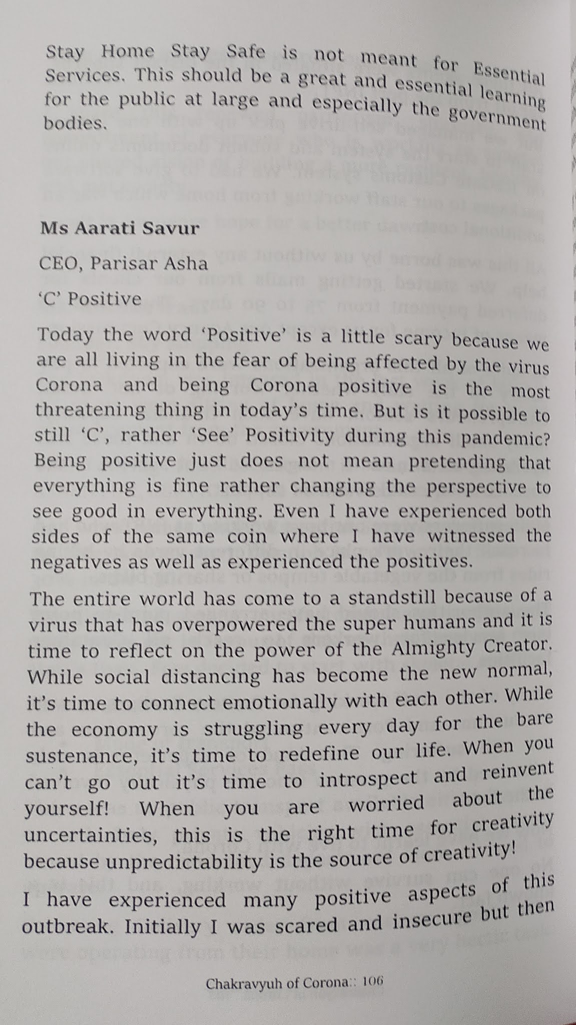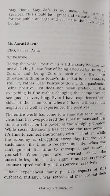 उरलेल्या पानांमध्ये वेगवेगळ्या लोकांचे कोरोनाबद्दलचे लेख आहेत. छोट्यामोठ्या कंपन्यांचे सीईओ, डॉकटर, समाजसेवी संस्थांमध्ये काम करणाऱ्या व्यक्ती, शालेय विद्यार्थी यांचे १-२ पानी लेख आहेत.