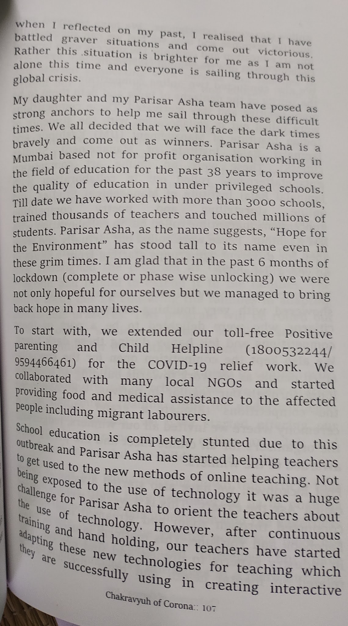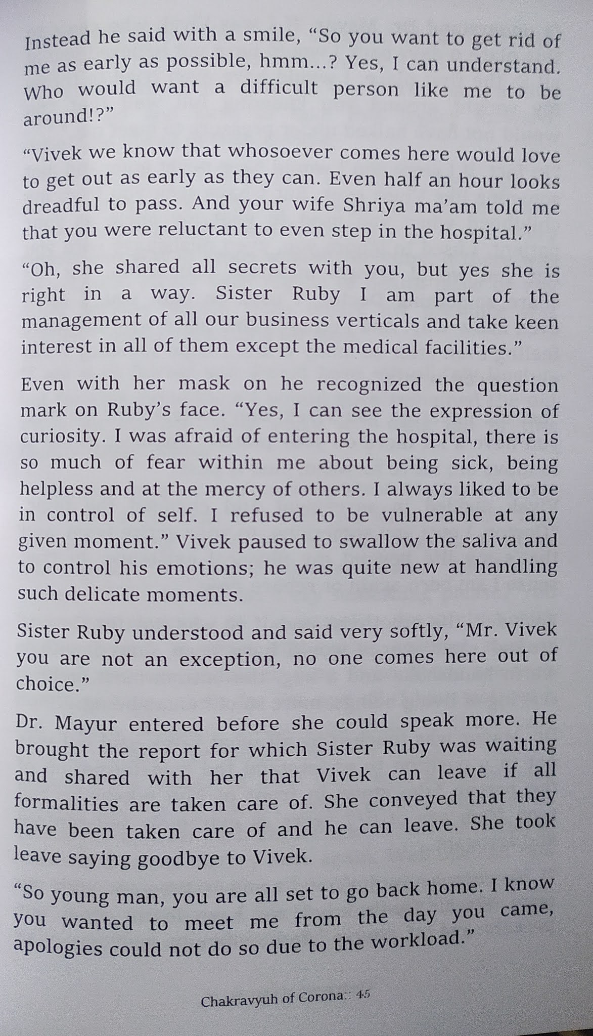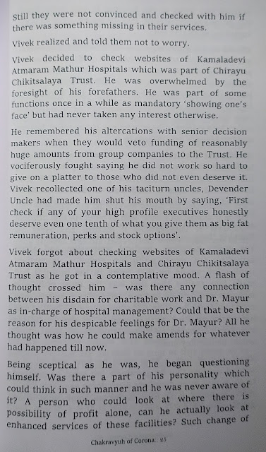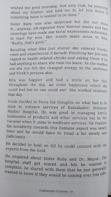 माझी आत्या माधुरी लेले हिने लिहिलेलं हे पुस्तक आहे. पुस्तकाचे दोन भाग आहेत. पहिल्या ८२ पानांमध्ये एक दीर्घकथा आहे. एका उद्योग घराण्यातली व्यक्तीला कोरोनाची लक्षणं दिसल्यामुळे हॉस्पिटलमध्ये भरती व्हावं लागतं. आणि त्या साताठ दिवसात हॉस्पिटलमध्ये कोरोनाची गंभीर परिस्थिती बघून त्याचं मन संवेदनशील होतं. असं कथाबीज आहे. त्यातली ही एकदोन पानं.