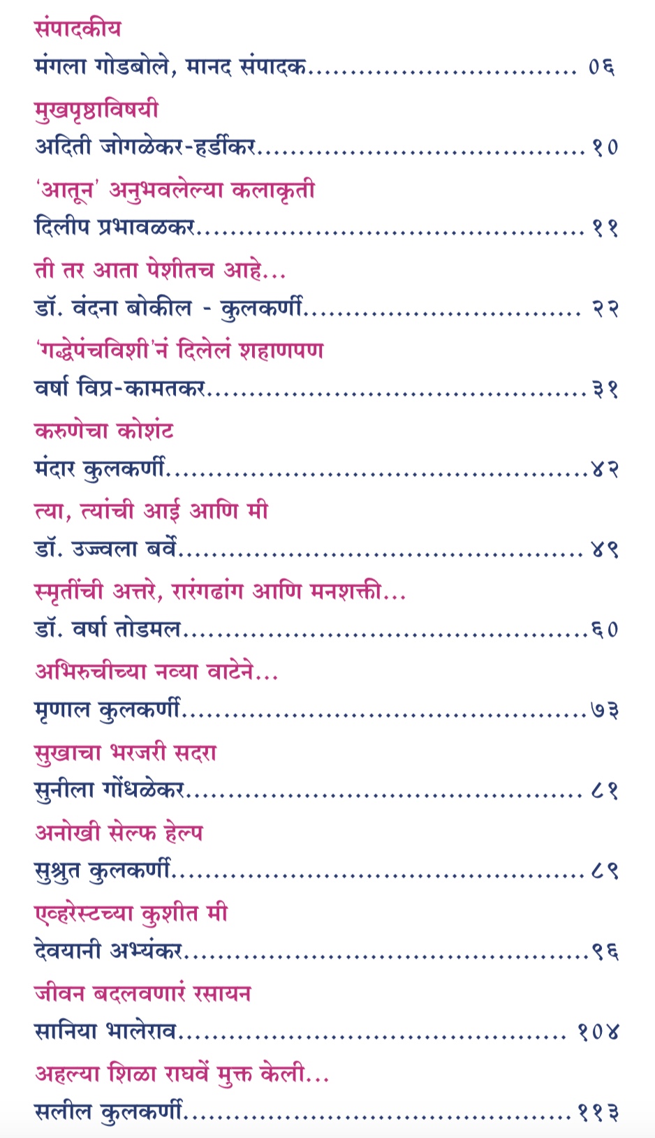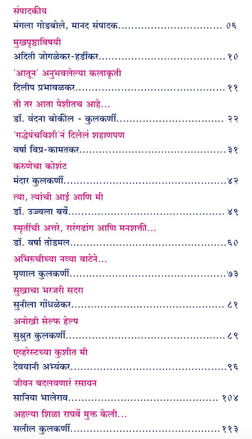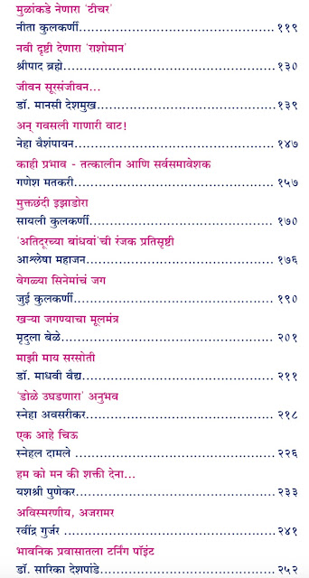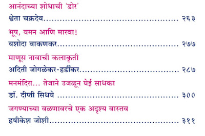 मासिकातल्या सगळ्या व्यक्ती मुळातल्याच संवेदनशील, भावनेचा ओलावा असणाऱ्या आहेत. त्यामुळे एक दोन वैज्ञानिक पुस्तकांचे उल्लेख सोडले तर भावांनाना साद घालणाऱ्या, दुसऱ्याला अजून चांगल्या पद्धतीने समजून घ्यायला शिकवणाऱ्या कलाकृतीच सगळ्यांना आवडल्या आहेत. त्यामुळे त्यातून मिळालेली शिकवण, वाढलेली प्रगल्भता हा मुद्द्यांचा लसावि आहे. त्यामुळे थोडा तोचतोचपणा लेखांमध्ये येतो.