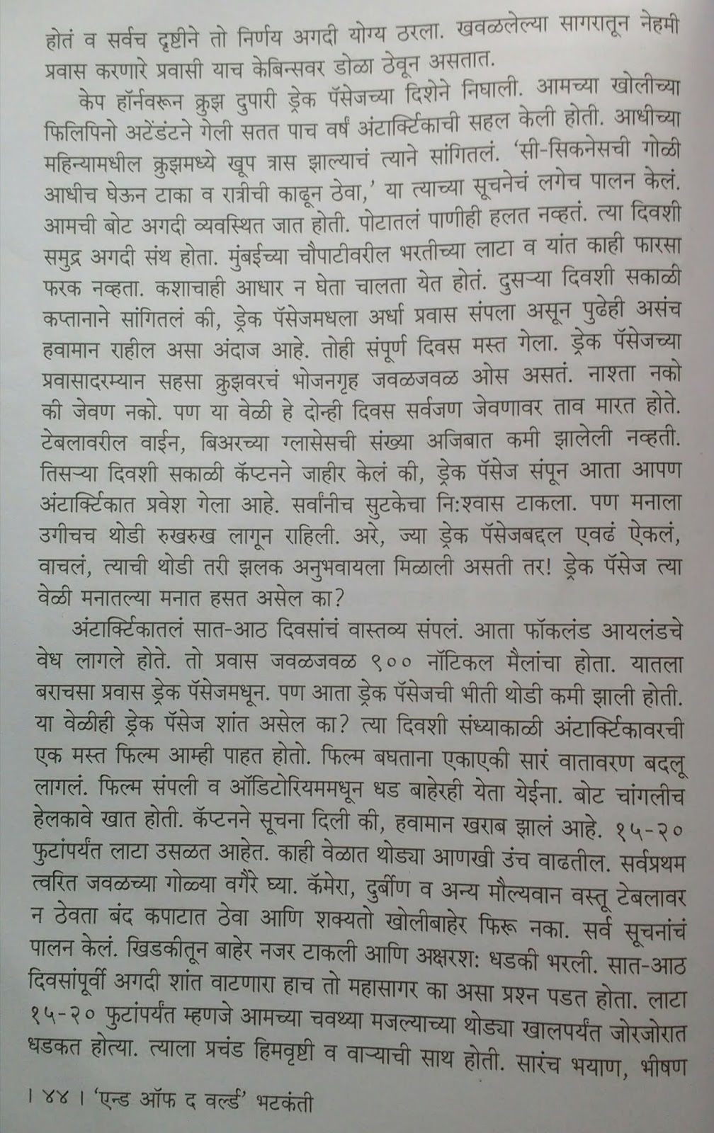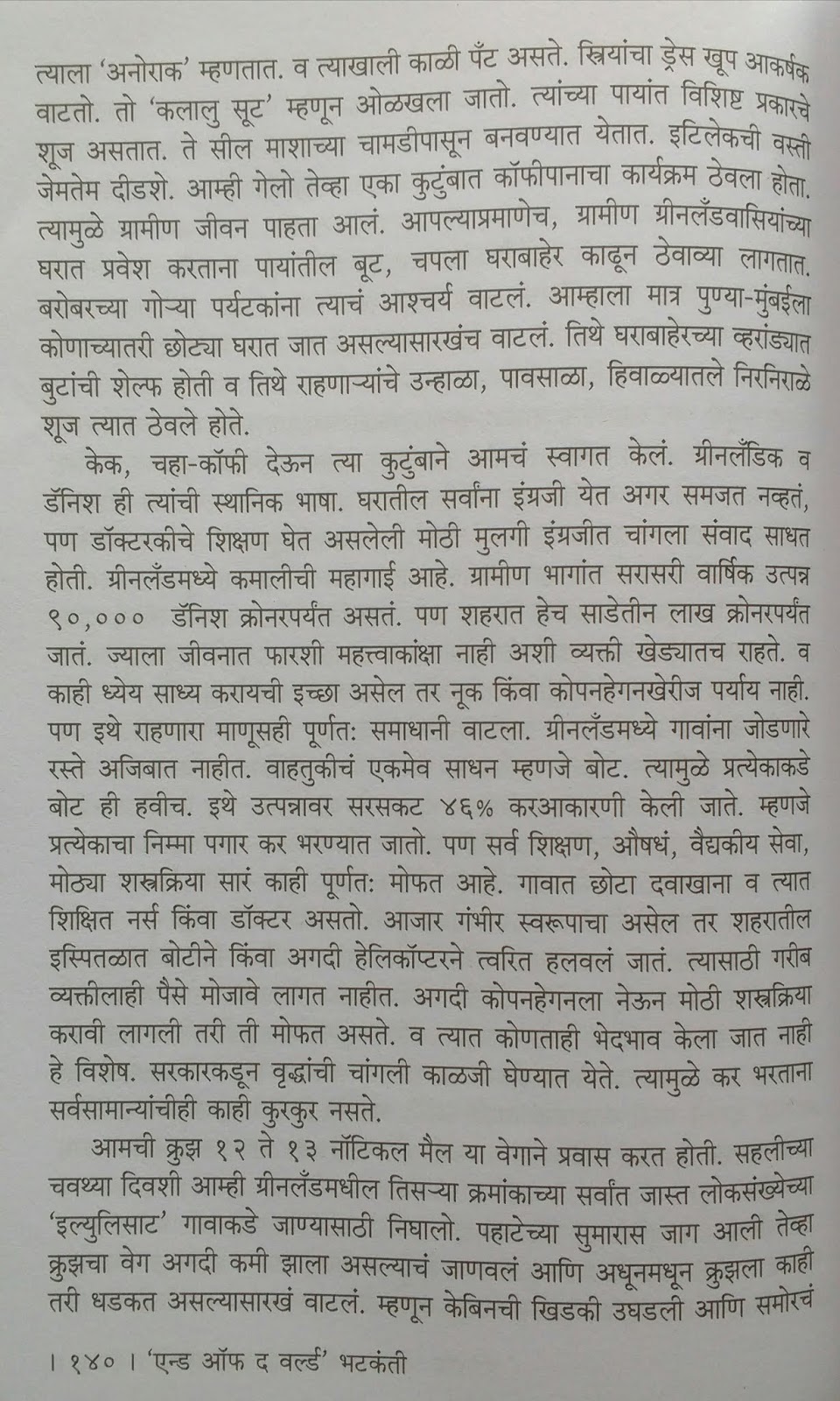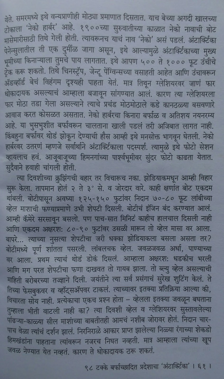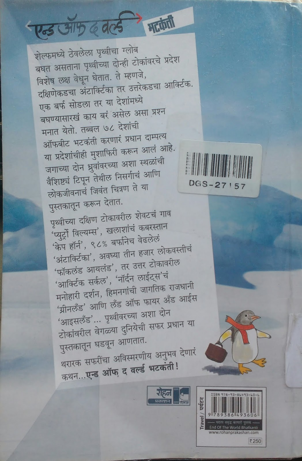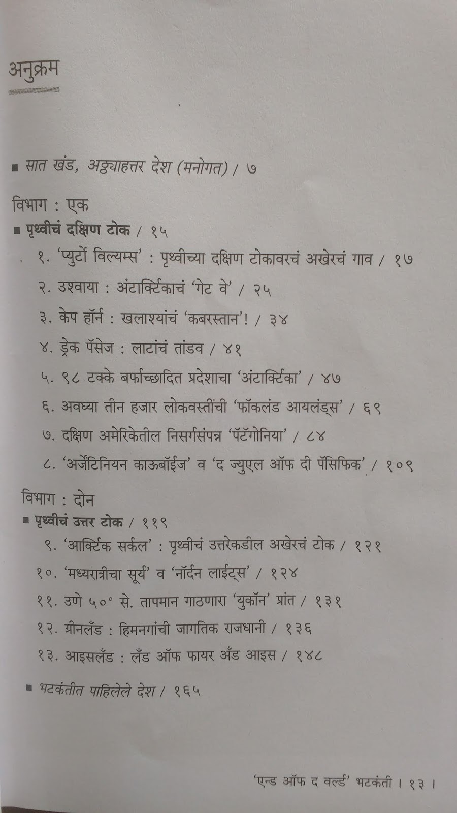 अशाप्रकारे या पुस्तकात “एन्ड ऑफ द वर्ल्ड” म्हणजे पृथ्वी ची शेवटची दोन टोकं इथला निसर्ग, प्राणी, पक्षी, खानपान, भौगोलिक परिस्थिती अशा वेगवेगळ्या पैलूंची माहिती दिलेली आहे. भावी पर्यटकांच्या दृष्टीने हे प्रवास कधी करावेत, कुठले व्हिसा लागतात हे खास नमूद केलं आहे. काय तयारी करावी लागते, काय टाळलं पाहिजे काय केले पाहिजे हे सुद्धा वर्णनाच्या ओघात सांगितले आहे.