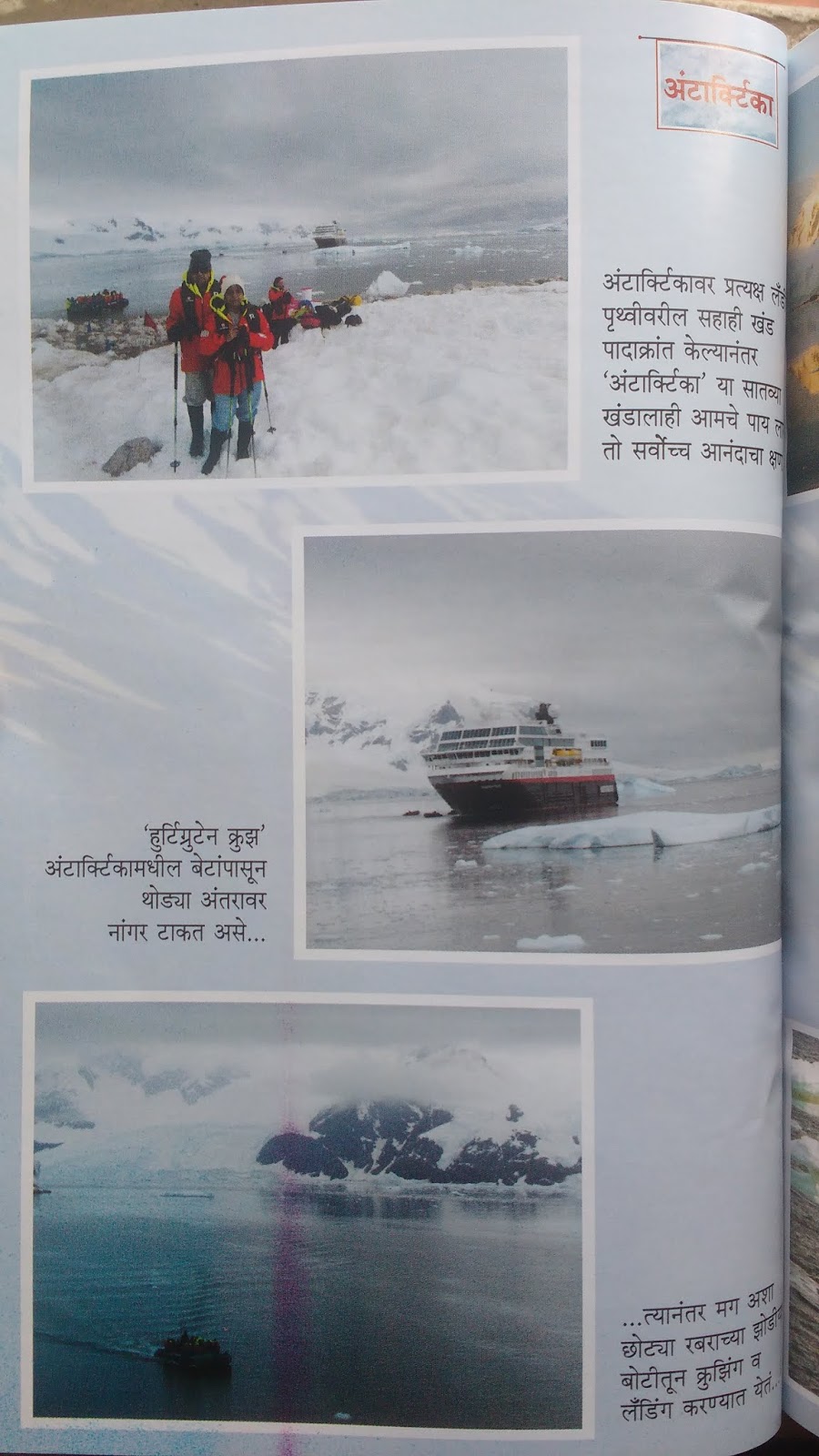 दक्षिण अमेरिकेतल्या टोकाला शेवटच्या नांदत्या शहरापासून त्यांची सफर सुरू झाली. मोठ्या क्रूज मधून महासागर ओलांडत ते अंटर्क्टिकाला पोहोचले. हिमनग, हिमनद्या यांचं स्तिमित करणारं दर्शन झालं. सील मासे, पेंग्विन, व्हेल सारखी जीवसृष्टीही त्यांनी जवळून बघितली. परतीच्या प्रवासात फॉकलंड आयलंड्स, पेंटागोनिया या दक्षिण अमेरिकेतल्या भागांना भेट दिली.