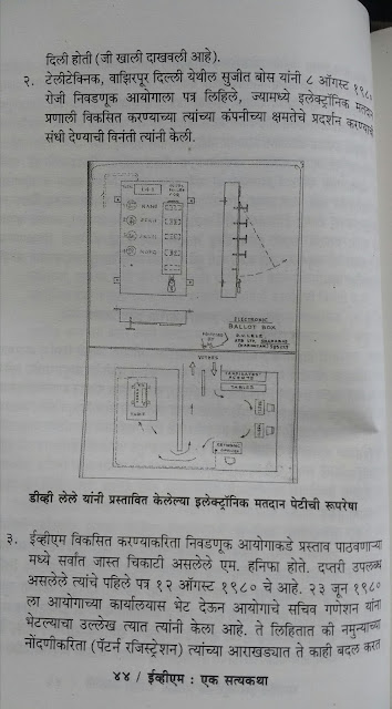 इलेक्ट्रिक यंत्र वापरण्याच्या कल्पनेचे श्रेय भारताचे सहावे निवडणुक आयुक्त एस. एल. शकधर यांना जाते. सत्तरच्या दशकात त्यांनी अशा यंत्राची आवश्यकता ओळखून इलेक्ट्रॉनिक्स कॉर्पोरेशन ऑफ इंडिया लिमिटेड (ECIL) ला अशा यंत्राची रचना मांडायला सांगितली. आयोगाची ही भूमिका जाहीर झाल्यावर इतर खाजगी कंपन्या आणि व्यक्तींनीही अशा यंत्रांचा प्रस्तावित आराखडा आयोगाकडे पाठवला. कोणीकोणी आणि कधी आराखडा पाठवला याची माहिती पुस्तकात आहे. माझे आडनाव बंधू(किंवा आडनाव आजोबा) असणाऱ्या डी.व्ही.लेले या गुलबर्ग्याच्या व्यक्तीने सर्वप्रथम असा प्रस्ताव पाठवलेला.