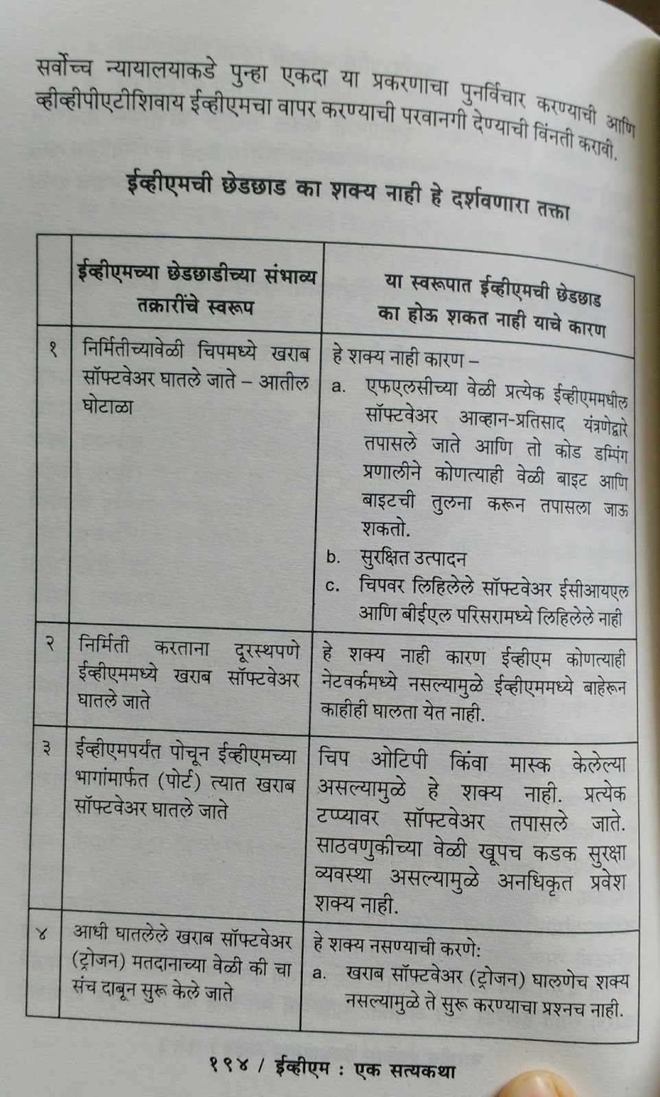 हरि के. प्रसाद या व्यक्तीने आयोगाची प्रत्यक्ष यंत्र मिळवली आणि दोन परदेशी तज्ञांच्या मदतीने त्यात छेडछाड करता येते असा व्हिडिओ बनवला होता. आपलं म्हणणं दखवण्यासाठी त्यांनी या यंत्राच्या हार्डवेअर मध्येच बदल केला होता. हार्डवेअर बदललं म्हणजे एका अर्थी दुसऱ्याच यंत्राचे दोष त्यांनी दाखवले असा अर्थ होतो. तरी असे बदल प्रत्यक्ष यंत्रात झाले तर ? याचाही ऊहापोह पुस्तकात आहे. यंत्रांची पुन्हा पुन्हा तपासणी, सर्व राजकीय पक्ष प्रतिनिधींसमोर तपासणी आणि सीलबंद करणे यामुळे असा कुठलाही बदल लगेच लक्षात येतो आणि यंत्र वापरले जात नाही. तसेच एखाद्या मतदारसंघाच्या निवडणुकीवर प्रभाव टाकायचा असेल तरी शेकडो यंत्रांमध्ये तो बदल करावा लागेल. हजारोंच्या नजरा ज्या यंत्रांवर रोखल्या असतात तिथे इतका मोठी छेडछाड शक्य आहे क? हे आणि असे अनेक मुद्दे मांडून कागदोपत्री शक्य पण प्रत्यक्ष नाही (थिअरिट्ट्कल्ल्य पोस्सिब्ले नोत प्रतिचल्ल्य) असं स्पष्ट केलं आहे. ईव्हीएम कुठल्याच यंत्राला किंवा इंटरनेटला जोडले नसल्यामुळे त्यात बाहेरून काही सॉफ्टवेअर घालताच येत नाही. अजुनही अत्याधुनिक तंत्रज्ञान कसं वापरलं आहे याची यादी आहे. सगळा तांत्रिक भाग नीट कळला नाही तरी. आपला विश्वास भक्कम होतो हे निश्चित.