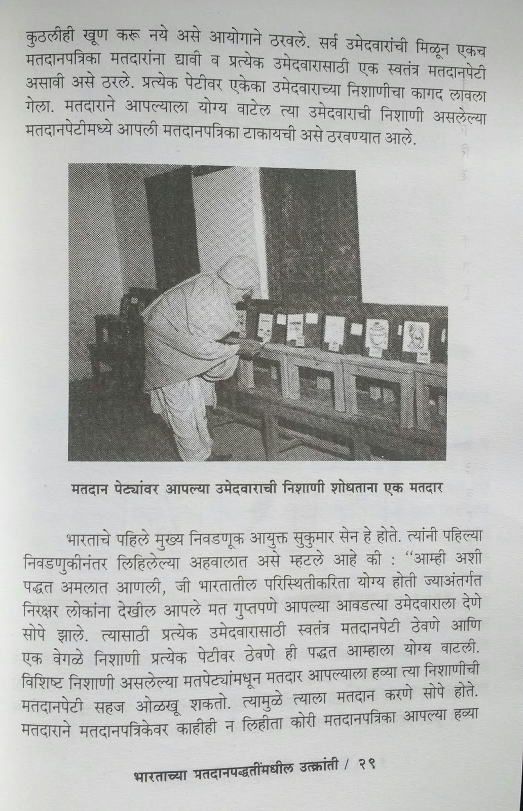 पुस्तकात निवडणुक प्रक्रियेत झालेल्या बदलांचा मागोवा घेतला आहे. उदा. अगदी पहिल्या निवडणुकांत प्रत्येक उमेदवारासाठी वेगळी पेटी असे. मतदार कोरी मतपत्रिका आपल्या पसंतीच्या उमेदवाराच्या पेटीत टाकत असे. नंतर उमेदवारांची नावं असणारी मतपत्रिका आली. लाकडाच्या ऐवजी स्टीलच्या पेट्या आल्या. मतदानकेंद्र बळकावण्याच्या घटना कशा घडायच्या याचेही दाखले आहेत. त्या त्या वेळच्या प्रक्रियेत काय त्रुटी किंवा अडचणी आहेत याचा थोडा उल्लेख आहे. जुनी छायाचित्रे सुद्धा आहेत.