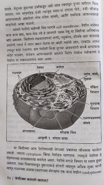 जीव नांदतो जेथे : पेशींची रचना, डीएनए, आरएनए इ. संकल्पना समजावून सांगितल्या आहेत. पुढच्या प्रकरणांसाठीची ही पूर्वतयारी. मी आधी म्हटल्या प्रमाणे घरगुती वापराच्या शब्दांतून कसं छान समजावून दिलं आहे बघा.