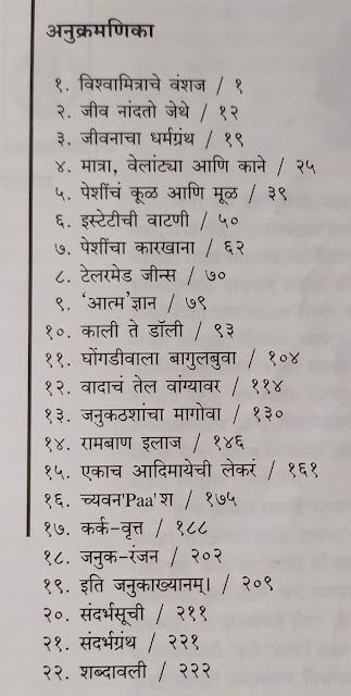 “संदर्भसूची”, “संदर्भग्रंथ” – संदर्भग्रंथ आणी वेबसाईट्सची यादी. मराठी वैचारिक पुस्तकांमध्ये अशी माहिती कमी दिसते. त्याबद्दल लेखिकेचे विशेष आभार.