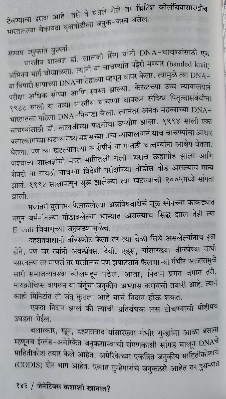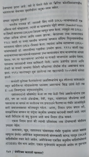 जनुकठशांचा मागोवा – गुन्ह्याच्या तपासामध्ये जनुकशास्त्राची मोलाची भर. गुन्ह्याच्या ठिकाणी मिळालेल्या पुराव्यातून संशयिताचे डीएनए मिळवून गुन्ह्याची सिद्धता कशी करतात; दोन व्यक्तींमध्ये आई-मुलगा/वडील-मुलगा नातं आहे का ते कसं ठरवतात