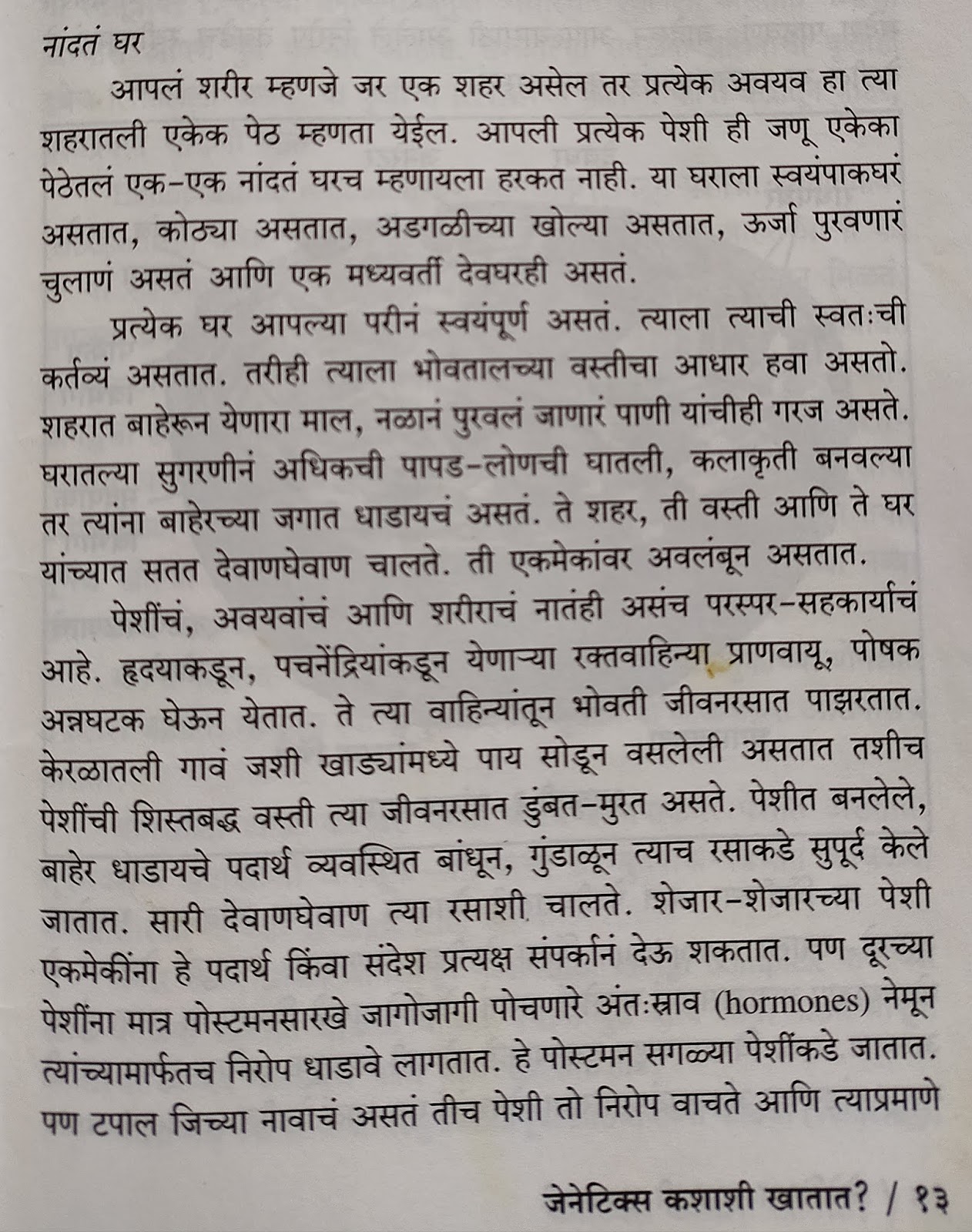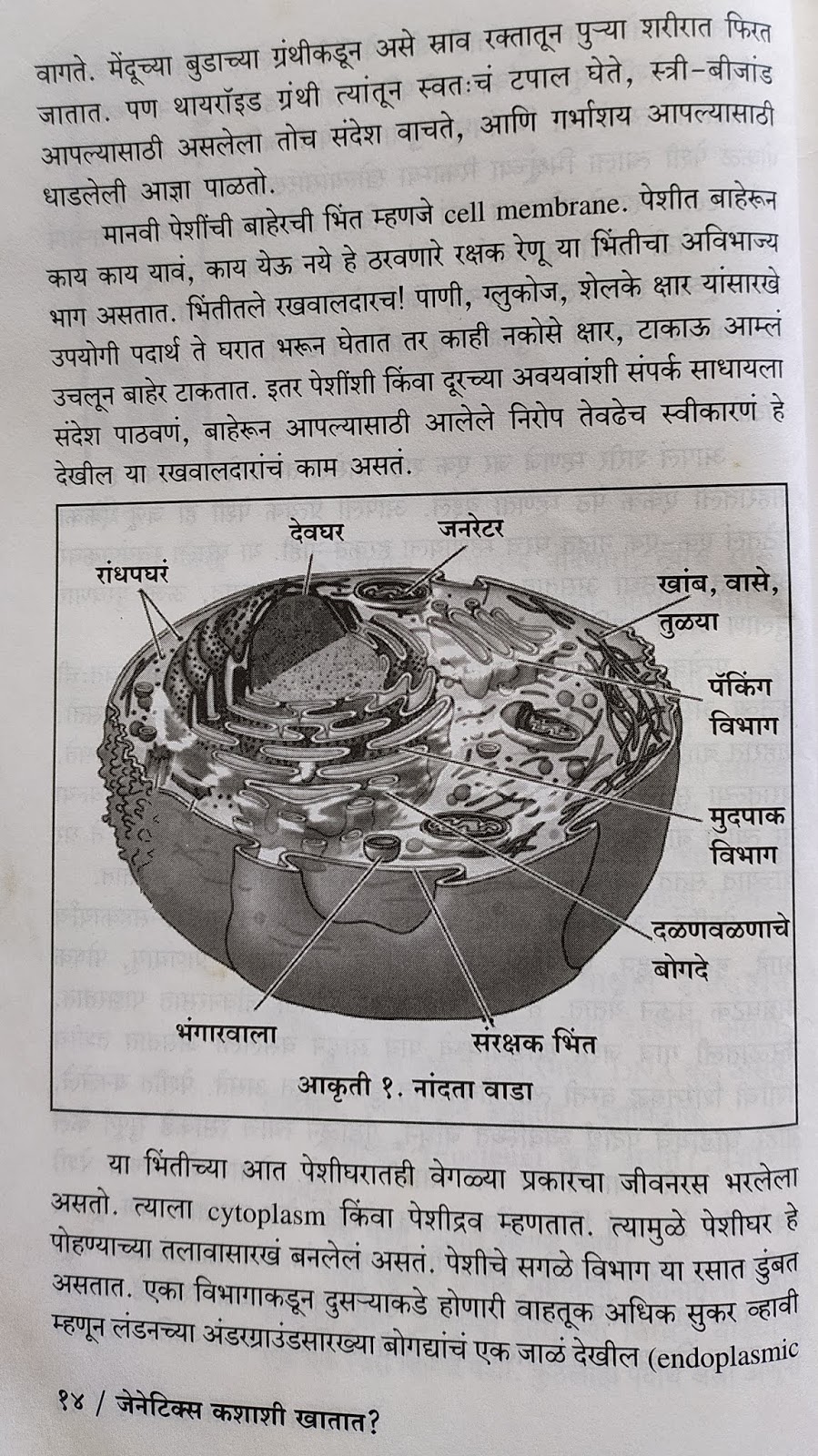 जीव नांदतो जेथे : पेशींची रचना, डीएनए, आरएनए इ. संकल्पना समजावून सांगितल्या आहेत. पुढच्या प्रकरणांसाठीची ही पूर्वतयारी. मी आधी म्हटल्या प्रमाणे घरगुती वापराच्या शब्दांतून कसं छान समजावून दिलं आहे बघा.
