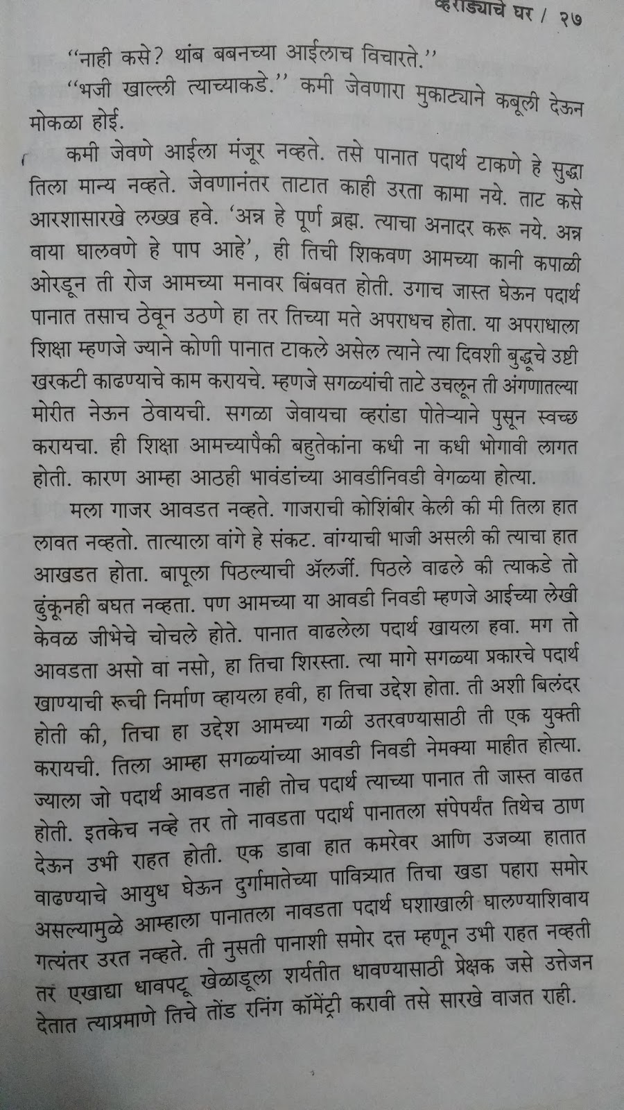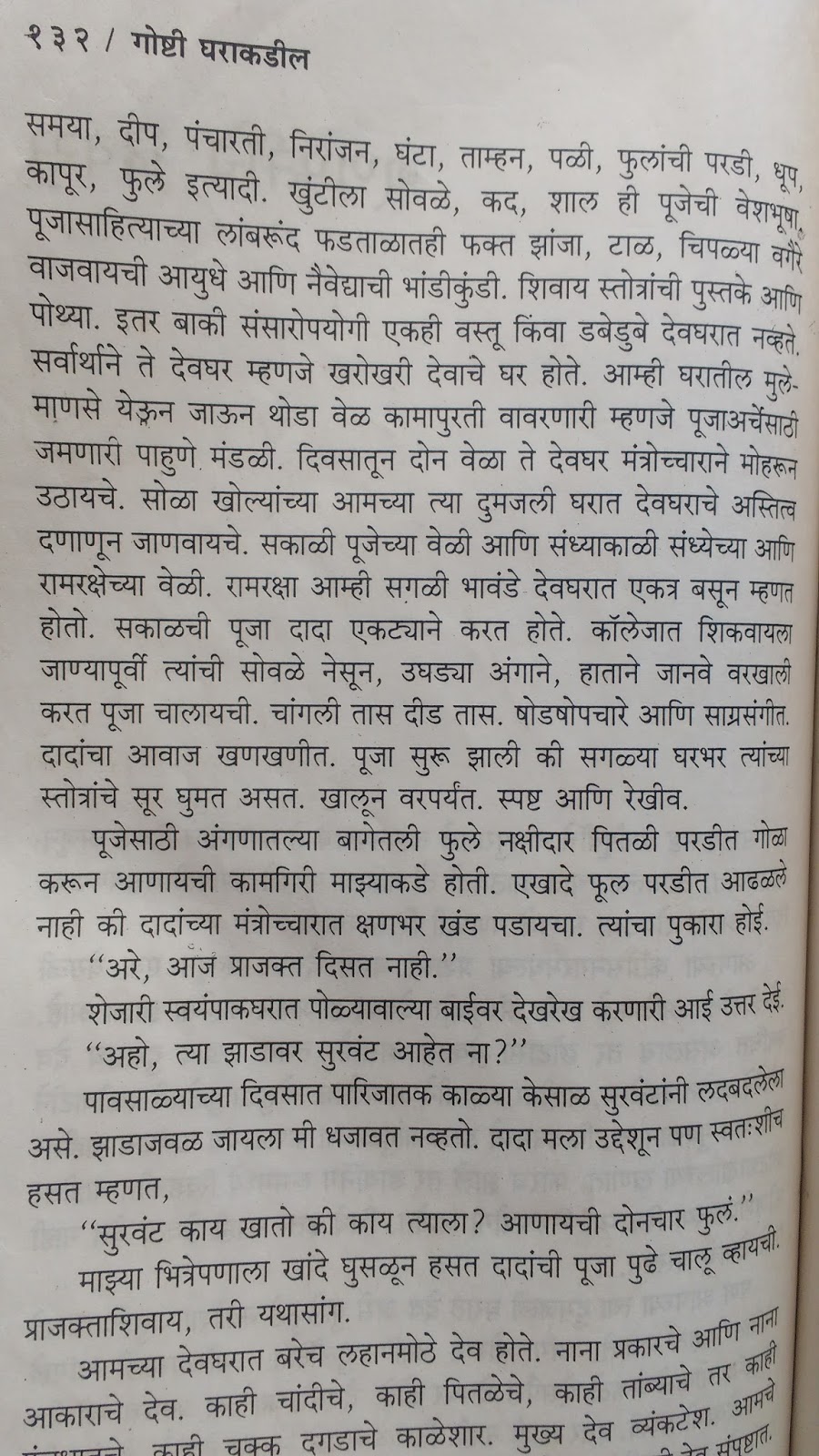 पूर्ण पुस्तक वाचायला मनोरंजक आहे. किस्से वाचायला कुणाला नाही आवडणार? एखाद्या मंगलकार्यासाठी घरात पाहुणे मंडळी जमलीयेत आणि रात्री गप्पा गोष्टी चालल्यात; कुणी जुन्या घराच्या, आजीआजोबांच्या आठवणी सांगतंय, आमच्यावेळी असं नव्हतं किंवा आमच्या वेळी तसं नव्हतं हे कुणी सांगतंय, कुणी आपल्या भावंडांच्या लहानपणच्या खोड्या आणि झालेल्या फजितीबद्दल सांगतंय … अशा गप्पा तासंतास रंगू शकतात. विषयाचे रूळ भराभर बदलत गप्पा मारणाऱ्यांना खिळवून ठेवू शकतात. या पुस्तकाचं रूप साधारण तसं आहे. या पुस्तकातल्या प्रत्येक लेखाला समांतर अशी आठवण तुमची, तुमच्या आईवडीलांची असेल. म्हणून हे पुस्तक वाचल्यावर वेगळं काही, सकस काही वाचल्याचं समाधान वाटणार नाही. विरंगुळा म्हणून छान आहे. १९४० च्या आसपासचा काळ म्हणजे खूप जुना काळही नाही. बरेचसे वाचक तो काळ जगलेले असतील. तरूण वाचकांनी इतर पुस्तकांमधून आपल्या ज्येष्ठ नातेवाईकांकडून ऐकलं असेल. त्यादृष्टिनेही पुस्तक फार आकर्षक नाही. कदाचित अजून शंभर दोनशे वर्षांनंतर १९४० च्या आसपास सधन घरांची कुटुंबव्यवस्था, मूल्यव्यवस्था कशी होती हे चित्र उभं करण्यासाठी हे पुस्तक एक चांगला सामाजिक दस्तैवज ठरेल हे मात्र नक्की.