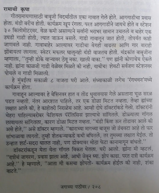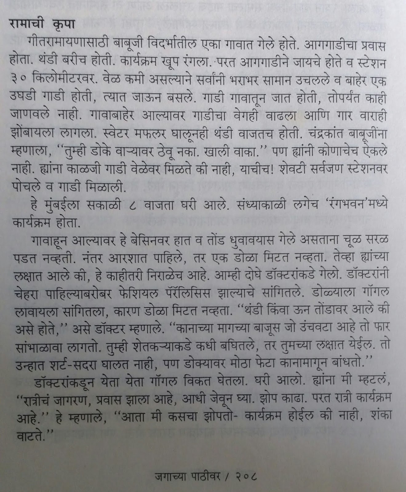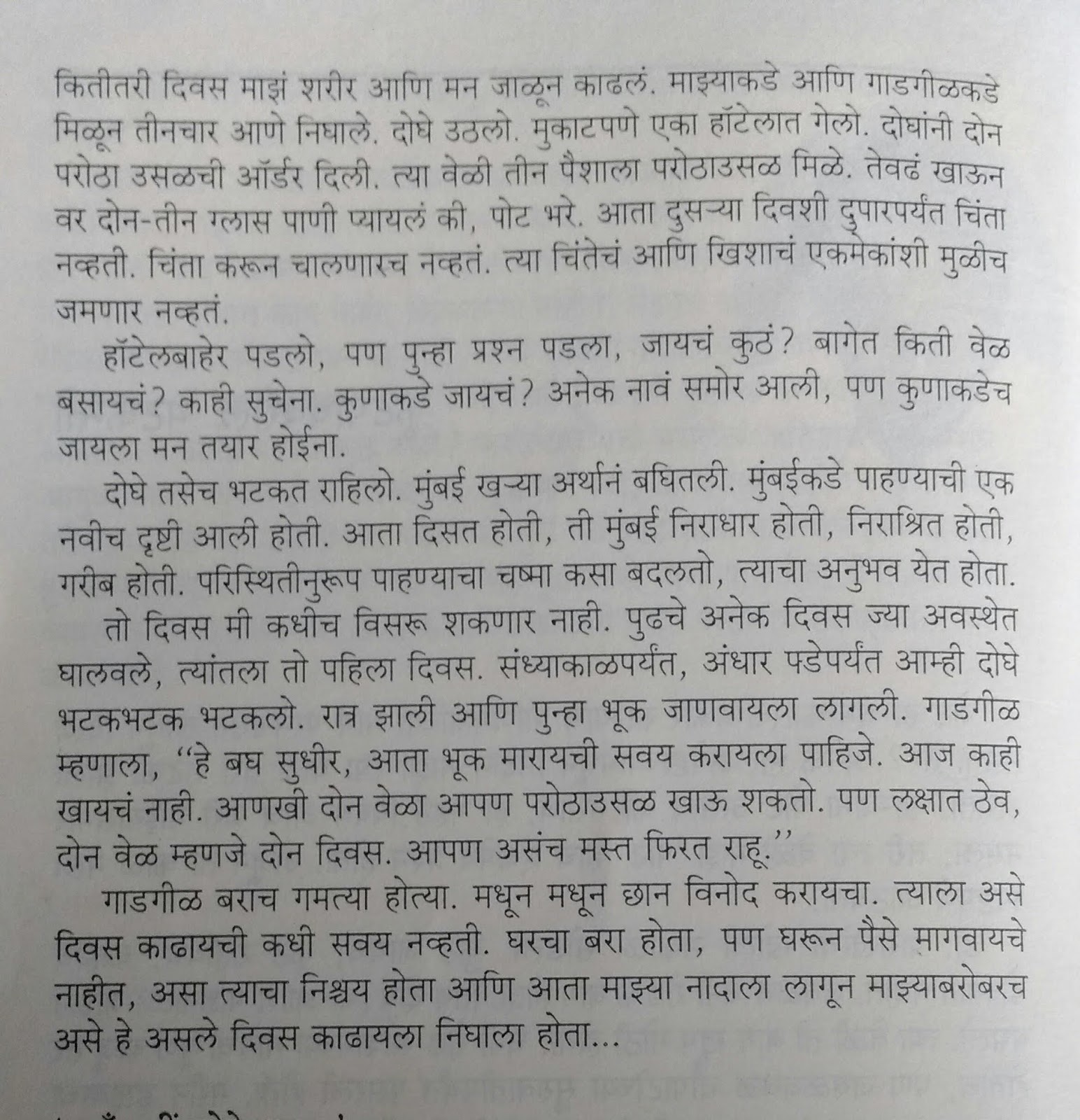 तिसरं म्हणजे आजकाल कलाकारांच्या मुलाखतीतून “स्ट्रगल” हा शब्द फार ऐकू येतो. एखाददुसरी मालिका केलेला अभिनेता; एकदोन गाणी गाजलेली गायिका सुद्धा आपण कसा “स्ट्रगल” केला ते सांगायला लागते. छोटी छोटी कामं करत शिकणं, हळूहळू मोठं होणं या उमेदवारीलाच लोक स्ट्रगल म्हणू लागलेत. अशा लोकांनी सद्गुणराशी असणाऱ्या बाबूजींचा खरा “स्ट्रगल” वाचायलाच हवा आणि आपण त्यामानाने खूपच सुस्थितीत आहोत यासाठी देवाचे आभारच मानायला हवेत.