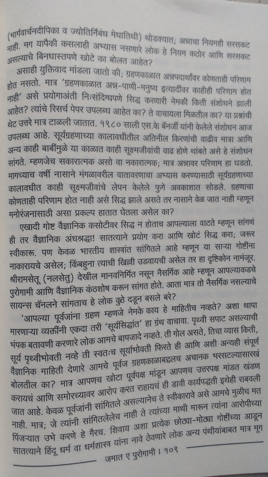 हिंदूंच्या अंधश्रद्धांवर तावातावाने बोलणारे बाकी धर्मियांच्या अंधश्रद्धांवर काही बोलत नाहीत. “संविधान बचाव” म्हणून ओरडणारे दुसरीकडे “भारत तेरे तुकडे होगे, इन्शा अल्लाह” म्हणणाऱ्यांची तळी उचलतात. विज्ञानवादी दृष्टिकोन ठेवतो म्हणणारे भारतीय शास्र आयुर्वेद यांची वैज्ञानिक चिकित्सेच्याही भानगडीत न पडता हे सगळं थोतांड आहे असं स्वतःच जाहीर करतात. अशा अनेक दुटप्पीपणाची, ढोंगींपणाची उदाहरणं देऊन लेखकांनी अपला मुद्दा स्पष्टपणे पुढे मांडला आहे.