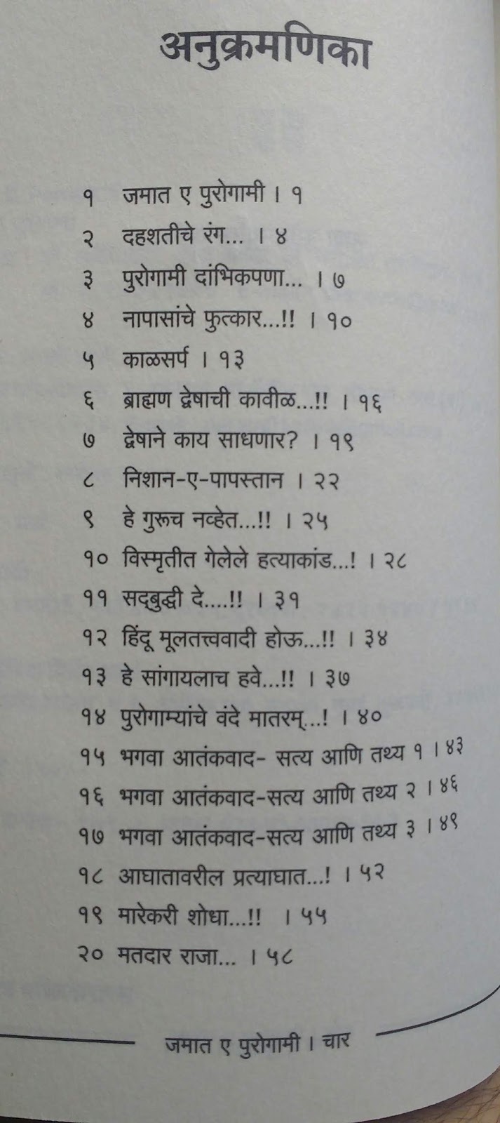 तर अशा खोट्या पुरोगाम्यांना या पुस्तकाने जमाते-पुरोगामी ही संज्ञा दिली आहे. जमातवाद म्हणजे टोळीवाद अर्थात माझी टोळी हीच चांगली, श्रेष्ठ; तिलाच जगण्याचा अधिकार बाकी सगळ्यांना शस्त्र, शास्त्र, शब्द यांनी तुटून पडायचं, विध्वंस करायचा. म्हणून हे जमात ए पुरोगामी. या विषयावर दोन्ही लेखकांनी तरूण भारत मध्ये लिहिलेल्या लेखांचा संग्रह आहे. अनुक्रमणिकेवरून लेखांच्या विषयांची साधारण कल्पना येईल.