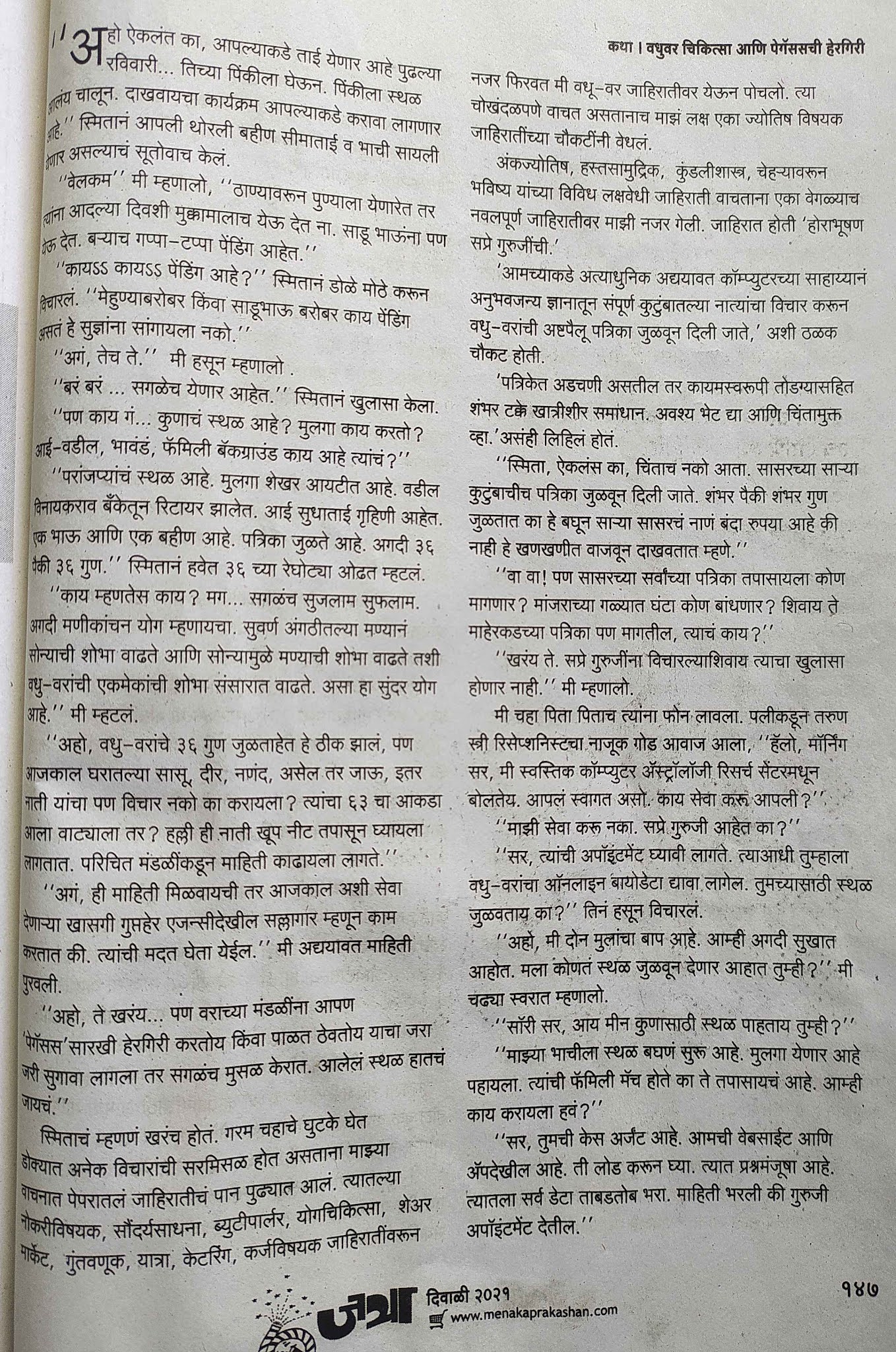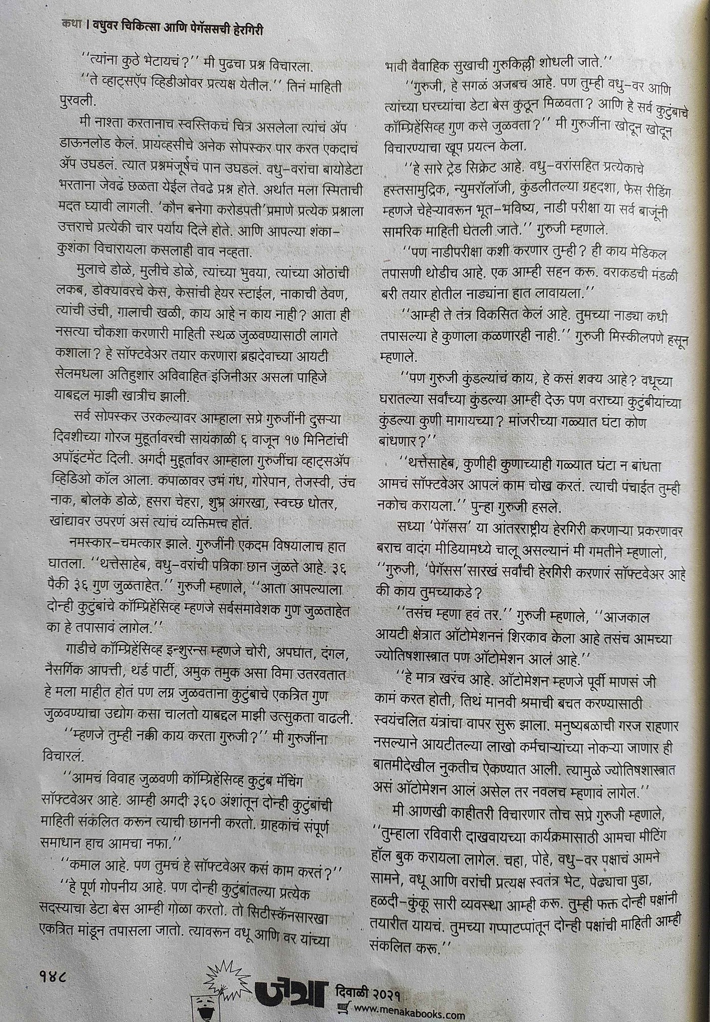 लग्न ठरवताना मुलामुलींची पत्रिका बघितली जाते. पण खरं तर दोन्ही कुटुंबाचे सुद्धा गुण जुळले पाहिजेत कारण लग्नामुळे शेवटी दोन्ही कुटुंब देखील एकत्र येतात. पण त्यासाठी सगळ्यांच्या पत्रिका कशा मिळवायच्या ? पण एक लग्न जुळवणारे गुरुजी नवीन व्यवसाय सुरु करतात की आम्हाला कंत्राट द्या आम्ही सगळं हे जुळवून आणतो. ते हे सगळं कसं करतात त्याची गमतीशीर गोष्ट आहे “… पेगासस हेरगिरी “