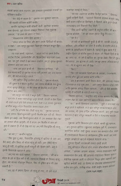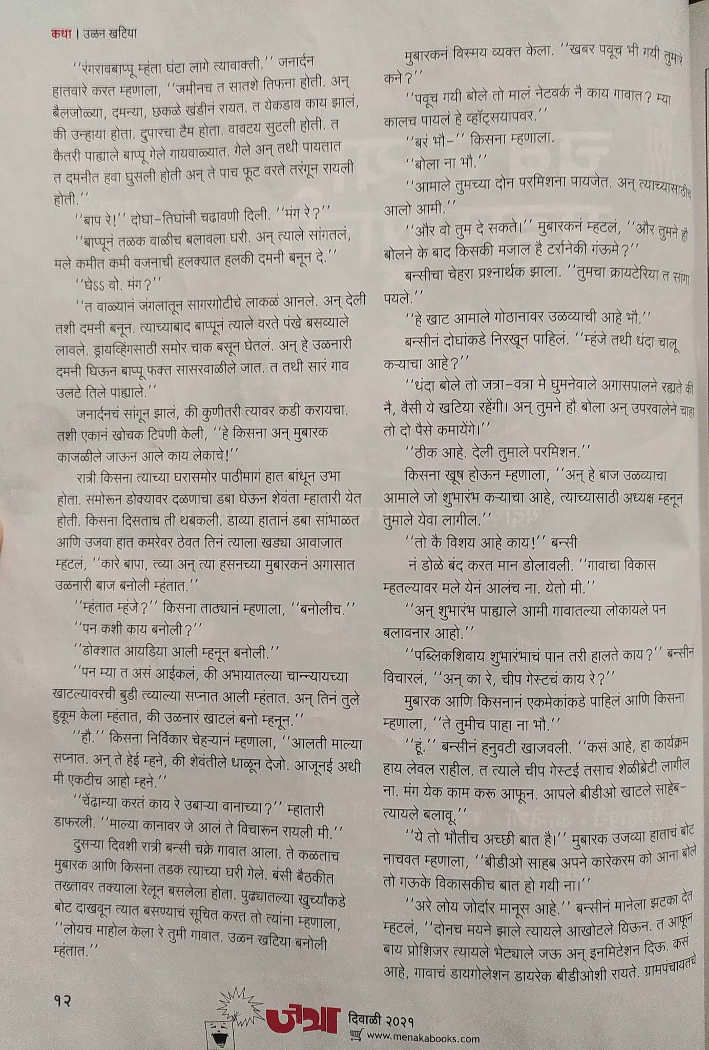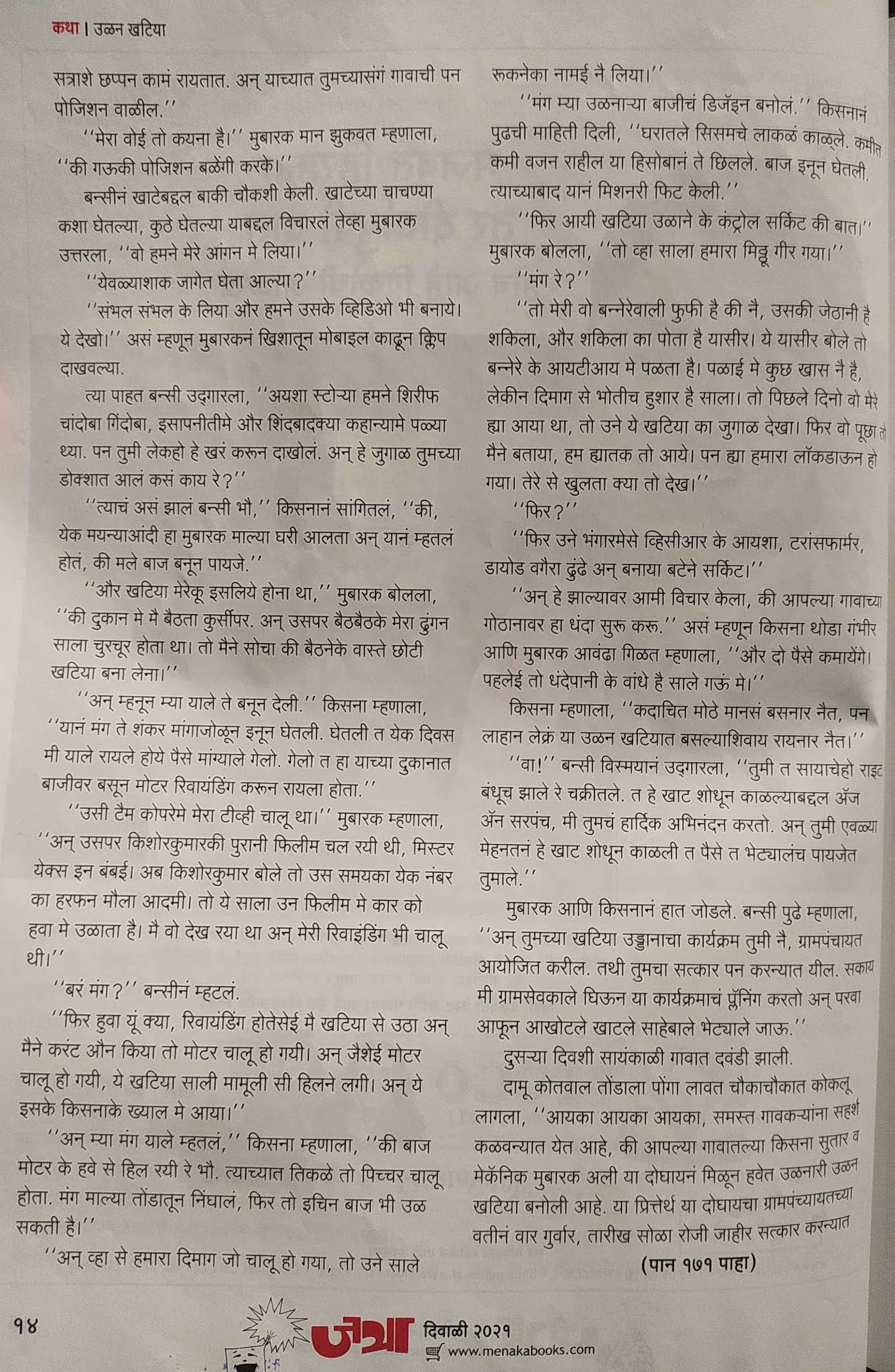 उळन खटिया – वऱ्हाडातल्या गावातले दोन कारागीर खाटेला पंखा लावून ती उडवण्याची शक्कल लढवतात. मग ती खाट खरी कशी उडते, तिचं उदघाटन करायला गावातलं राजकारण कसं रंगतं ह्याची धमाल सांगणारी ही कथा आहे. विनोदी प्रसंग आणि त्याला खास वऱ्हाडी बोलीचा मजा अशी दुहेरी धमाल ह्यात आहे. नमुन्यादाखल त्यातली दोन पाने.
