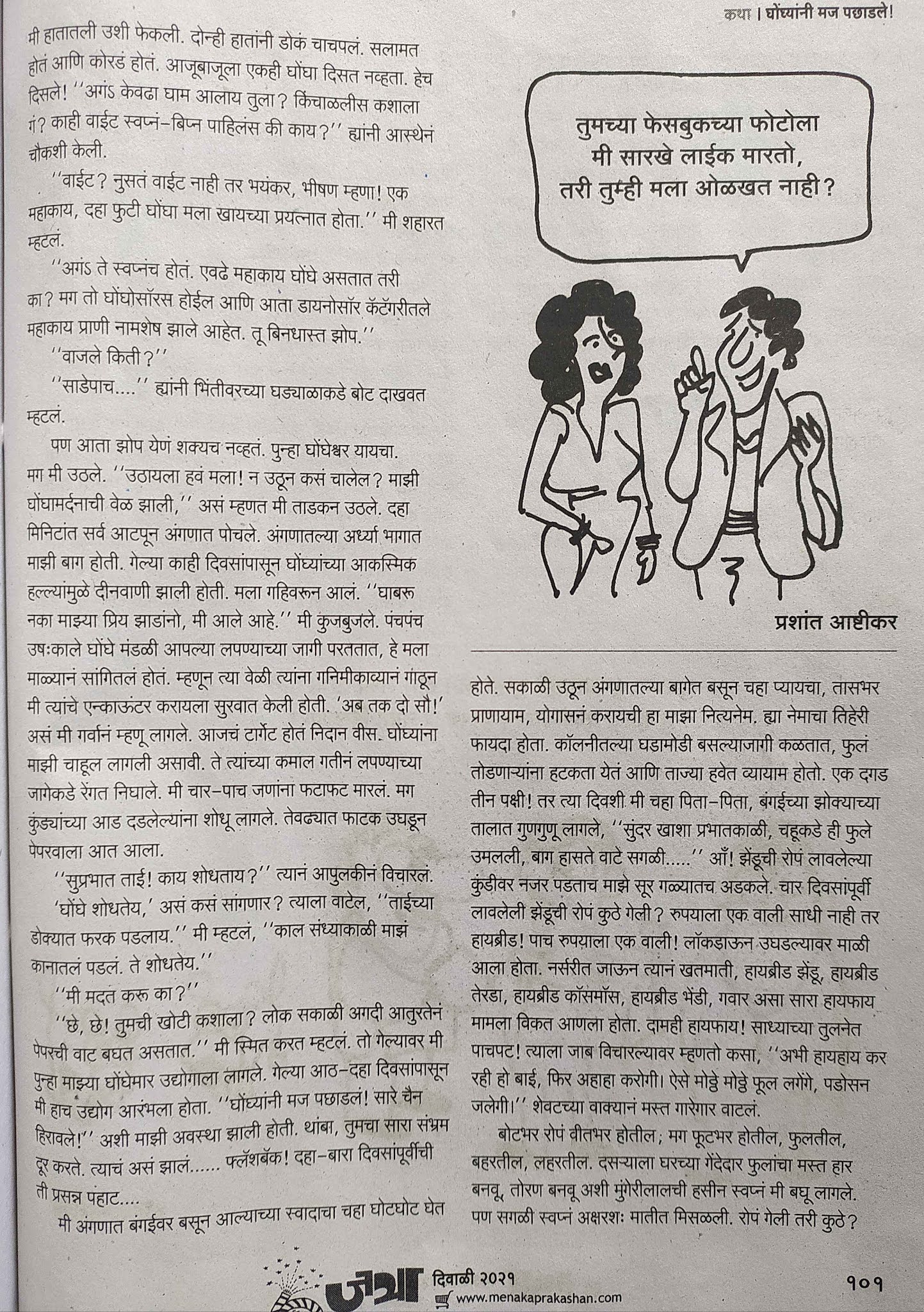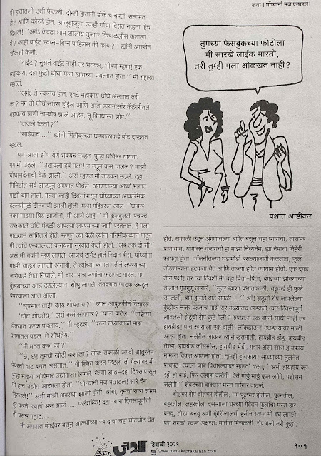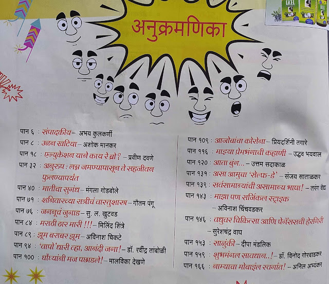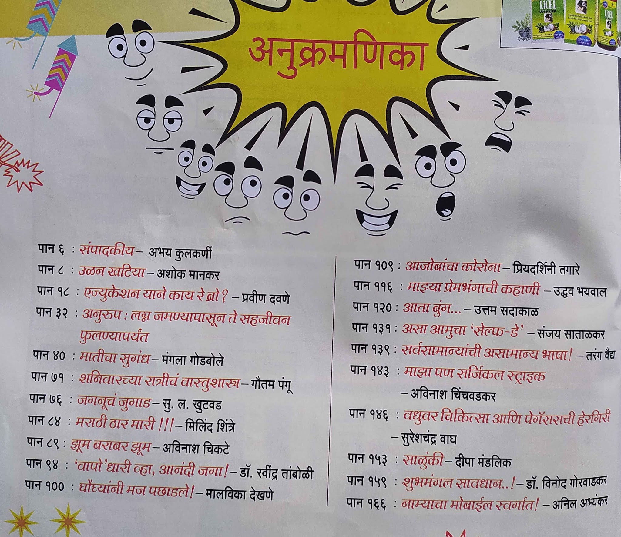 असा हा खुदुखुदू हसायला लावणारा, कधी गुदगुल्या करणारा तर कधी चिमटे काढणारा; “ताण विरहित”करणारा दिवाळी अंक आहे. सभ्यतेची पातळी फार घसरु न देता, सामाजिक भावना न दुखावता हसवणं -जे हल्ली कमी झालंय – तसा हसवणारा हा “जत्रा” अंक आपल्याला जत्रेतल्या पाळण्यात बसल्याची मजा देईल.