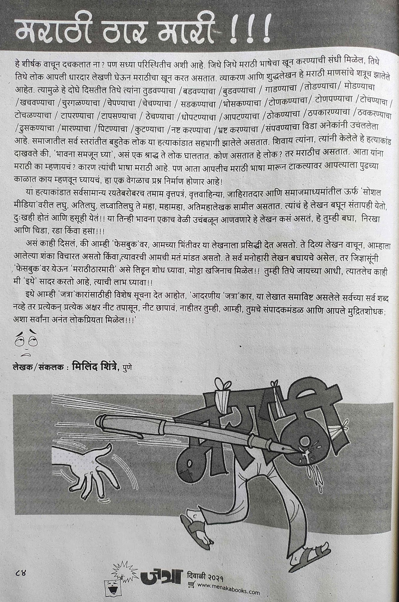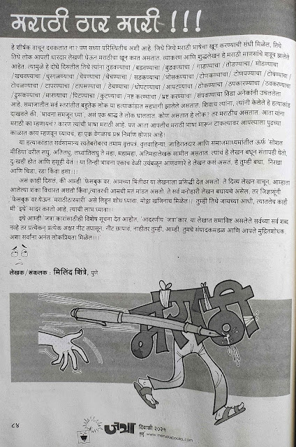 एकीकडे इंग्रजी स्पेलिंग्स इतकी अनियमित तरी आपण ती पाठ करतो. इंग्रजी वापरताना स्पेलिंगची चूक झाली किंवा व्याकरणाची चूक झाली की आपण दुसऱ्यांना हसतो. मात्र आपली मातृभाषा वापरताना प्रमाणलेखन, व्याकरण, शब्दांचे अर्थ ह्याचा आपण तितका विचार करतो का ? फेसबुक, व्हॉट्सप वरच्या लेखनात तर लोक असंख्य चुका करतातच पण वृत्तपत्र, वृत्तवाहिन्या ह्यांच्या बातम्या सुद्धा बऱ्याच वेळा “भयंकर मराठी”त लिहिलेल्या असतात. अश्या मराठीच्या मारेकऱ्यांचा समाचार घेतलाय मिलिंद शिंत्रे यांनी. मराठी लेखनातल्या चुकांची उदाहरणे आणि त्यावर शिंत्रे ह्यांची तिरकस शेरेबाजी असं लेखाचं स्वरूप आहे. त्यांच्या फेसबुक पेजवर अजून बरीच उदाहरणं वाचता येतील.