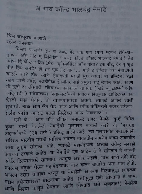 “अलाणे-फलाणे” या या सदरात श्री. अलाणे आणि श्री.फलाणे ही टोपणनावाने घेऊन दोन मित्रांचा मजेशीर पत्रव्यवहार आहे. एका पत्रात भालचंद्र नेमाडे हा विषय अहे. त्याची एक झलक:
