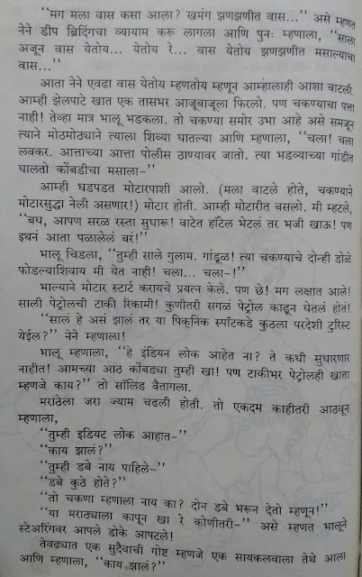 “आपुले मरण पाहिले म्यां डोळा” पण मजेशीर आहे. दळवी गेले अशी अफवा पसरली आणि त्यांच्या घरी फोन, भेटायला माणसं यायला लागली. या बातमीवर प्रत्येकाच्या प्रतिक्रिया कशा होत्या आणि त्यावर दळवींच्या प्रति-प्रतिक्रिया कशा होत्या हे वाचतना खूप हसू येतं.