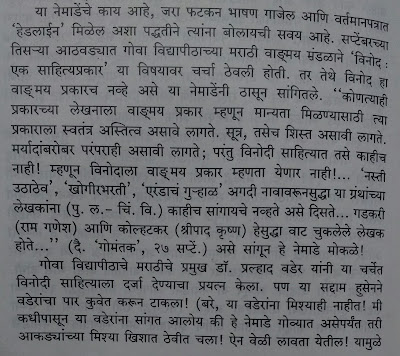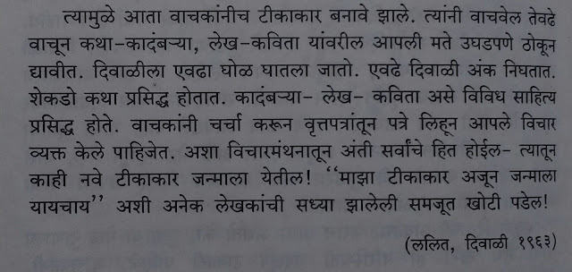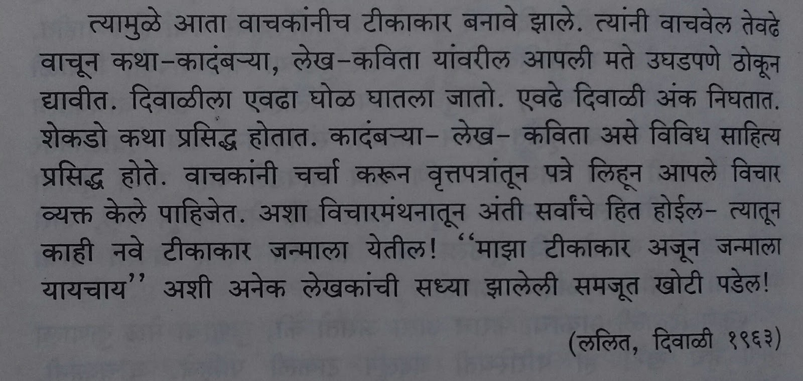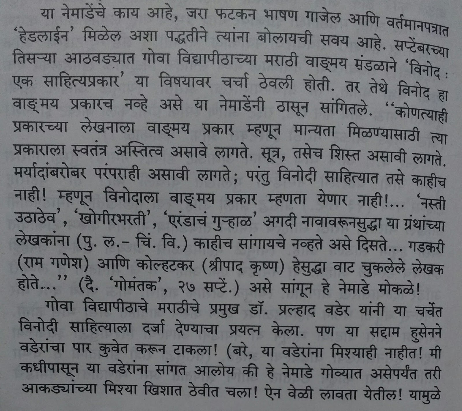 पुस्तक विनोदी आहे म्हणुन वाचायला मजा येतेच पण तीसेक वर्षांपूर्वी साहित्य आणि नाटकं हे मध्यमवर्गीय मराठी माणसाच्या विरंगुळ्याचे आणि चर्चेचे विषय असतानाचं वातावरण कसं होतं हे आज (टीव्हीचा जमाना मागे पडून ऑनलाईनचा जमाना आल्यावर) वाचताना नव्या पिढीला वेगळी जाणीव आणि जुन्या पिढीला पुनर्भेटीचा आनंद नक्की देईल.