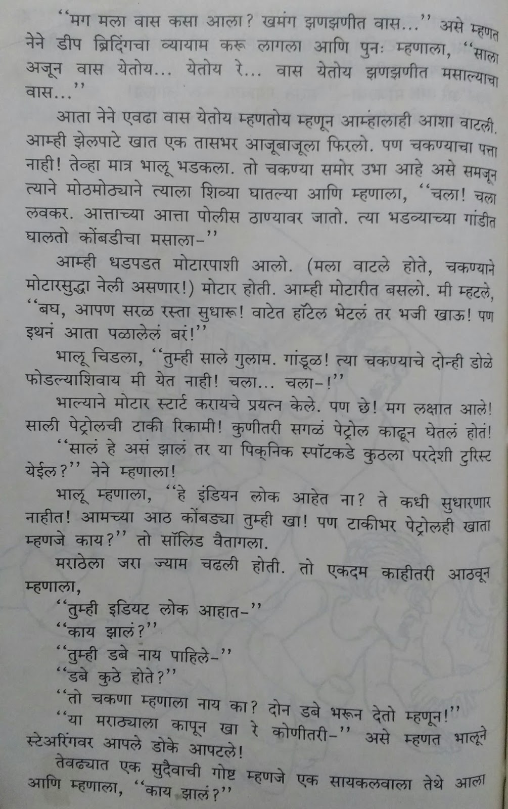 उदा. “एका सहलीची गोष्ट” मध्ये एक गावकरी माणूस मटण बनवून द्यायचे कबूल करून गावात सहलीला आलेल्या तरुणांकडून पैसे घेतो. कितितरी वेळ झाला तरी जेवण काही येतच नाही. इकडे दारू पार्टी केलेले तरूण चिडतात तो प्रसंग :