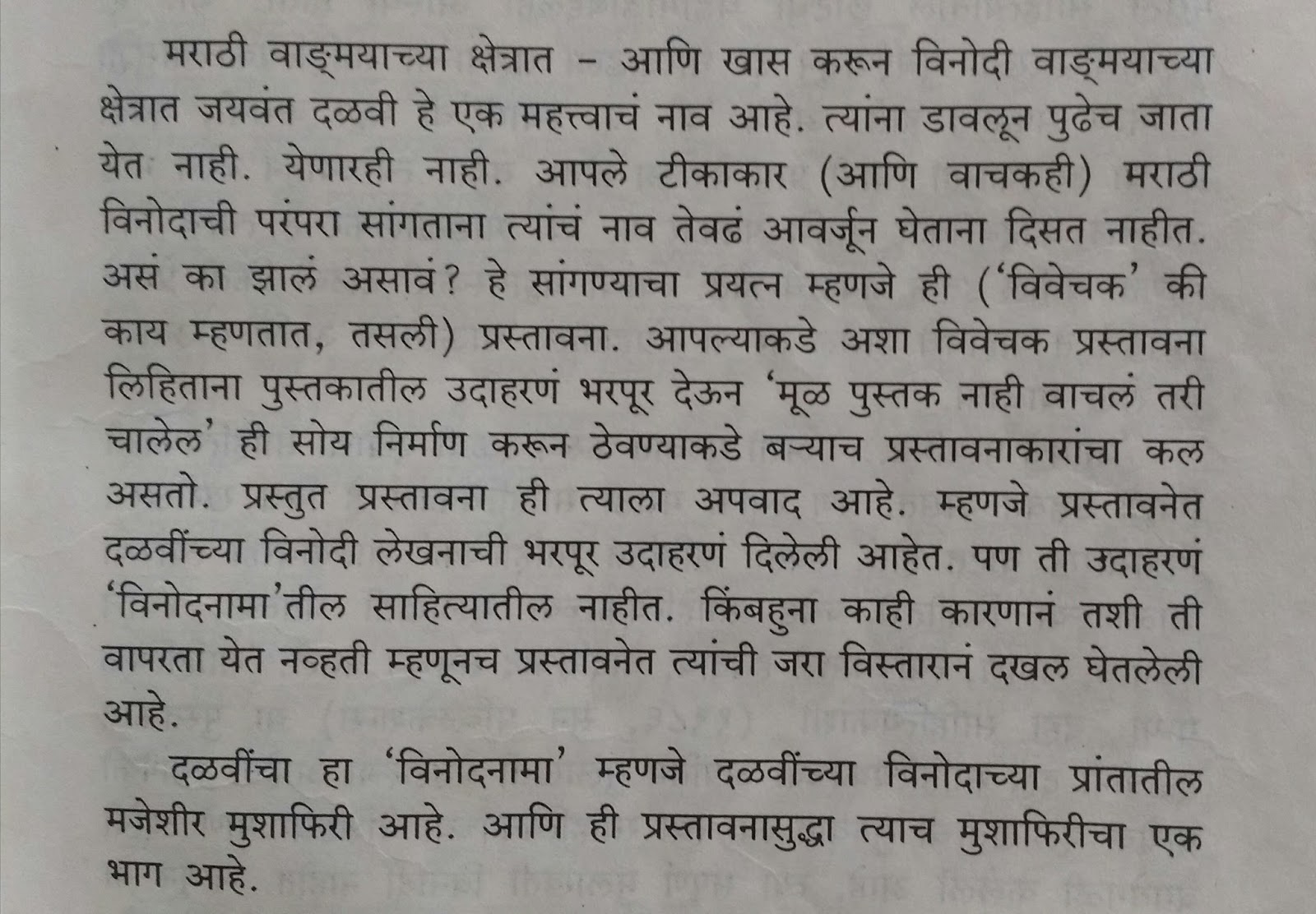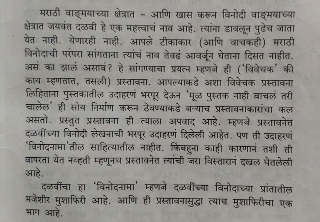 प्रस्तावनेतही त्यांनी या पुस्तकात नसलेल्या काही विनोदी लेख किंवा कथांमधले परिच्छेद उद्धृत केले आहेत. त्यामुळे विनोदाची मेजवानी प्रस्तावनेपासूनच सुरू होते. दळवींच्या विनोदी लेखनशैलीचे त्यांनी विश्लेषण केले आहे. अत्रे-पुल यांना मराठी समाजाने डोक्यावर घेतलं तसं दळवींना का घेतलं नाही याचा ऊहापोह केला आहे. म्हणून प्रस्तावनाही तितकीच वाचनीय आहे.