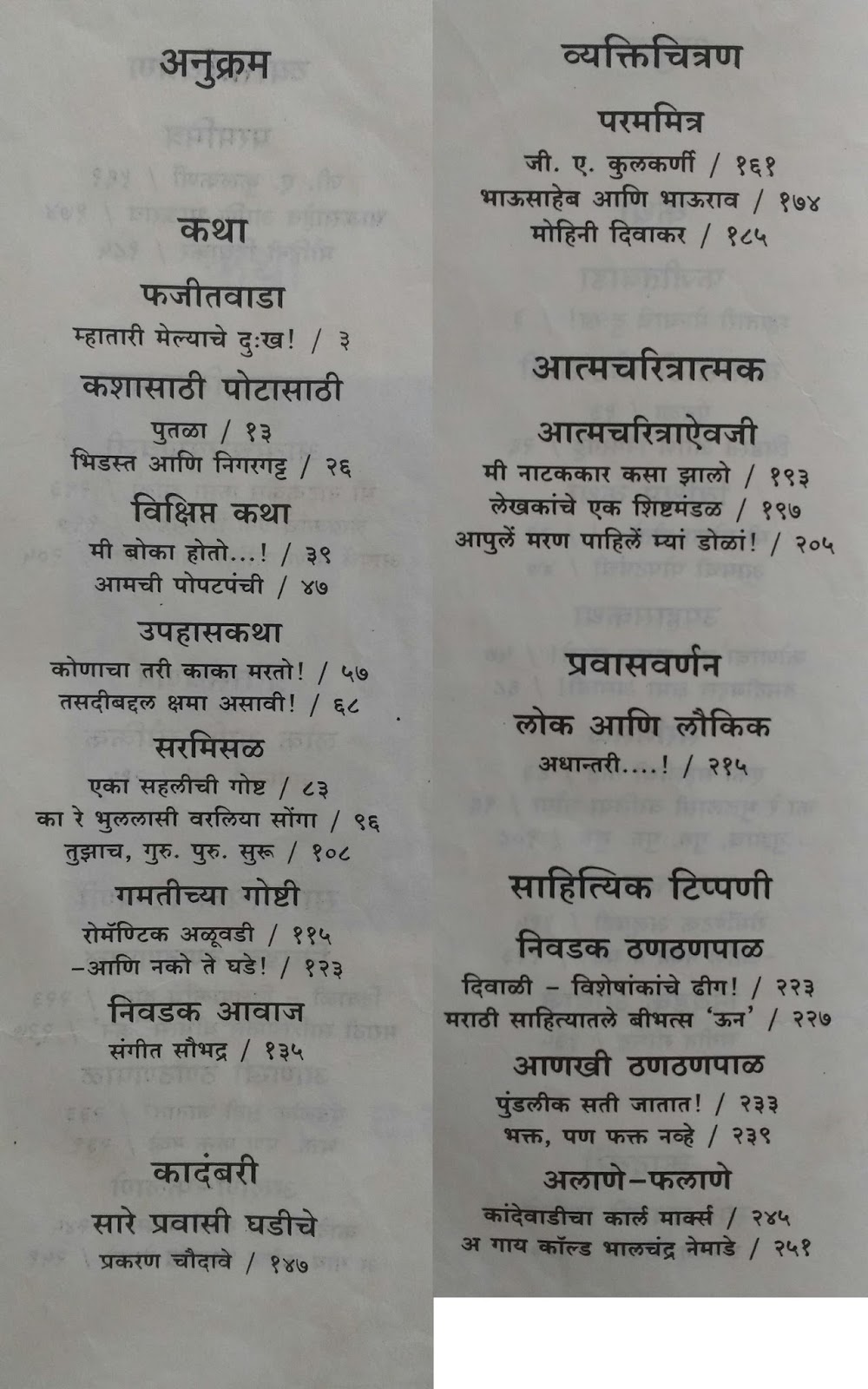 प्रसिद्ध मराठी लेखक जयवंत दळवी यांच्या निवडक विनोदी साहित्यकृतींचा हा संग्रह आहे. अनुक्रमणिकेवर नजर टाकली की पुस्तकाबद्दल कल्पना येऊन जाईलच.