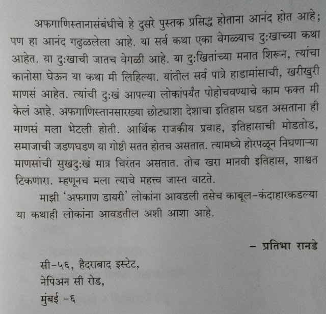 “प्रतिभा रानडे” हे नाव पाकिस्तान, काश्मीर या संदर्भातल्या लेखांमध्ये वाचले होते. पण त्यांचे पुस्तक पहिल्यांदाच वाचले. लेखिकेने स्वतः अफगाणिस्तानात वास्तव्य केले होते. त्याकाळात त्यांना अफगाणिस्तान आणि अफगाणी समाजजीवन जवळून पहायला मिळाले. त्याच्याच कथा या पुस्तकात आहेत. पुस्तकाच्या छोटेखानी प्रस्तावा वाचली तरी लेखिकेची भूमिका आणि या पुस्तकात काय आहे हे लगेच कळेल.