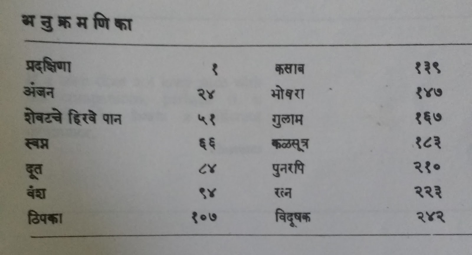 सद्यकालीन कथा, कथा म्हणून चांगल्या आहेत. पण एकजात सर्व कथांमधलं वातावरण फारच निराशाजनक आहे. जगण्यातल्या ज्या ज्या नकारात्मक बाजू असतील त्या आठवणीने गोळा करून कथा लिहिल्या आहेत. दुःख, दैन्य, दारिद्र्य, अपमान, विश्वासघात, अत्याचार, मृत्यू, अपेक्षाभंग अशा सगळ्या गोष्टी प्रत्येक कथेत भरपूर !! बहुतेक वेळा नायिका वृद्ध, जीवनाला विटलेल्या आहेत. तरूण वयाच्या असतील तर दारिद्र्याने गांजलेल्या, निपुत्रिक आहेत. नायक हे दरिद्री, व्यसनी, घरच्यांकडून अपमानित झालेले. त्यांच्या बायका-मुली बाहेरख्यालीपणा करतात, मुलं वाया जातात. गावातली आजूबाजूची मंडळी पण एकमेकांचे खून करणारी, लुबाडणारी. निर्सर्गाचं वर्णन पण सतत अंधारून आलंय, मळकट संधीप्रकाश, कुबट वातावरण असं.