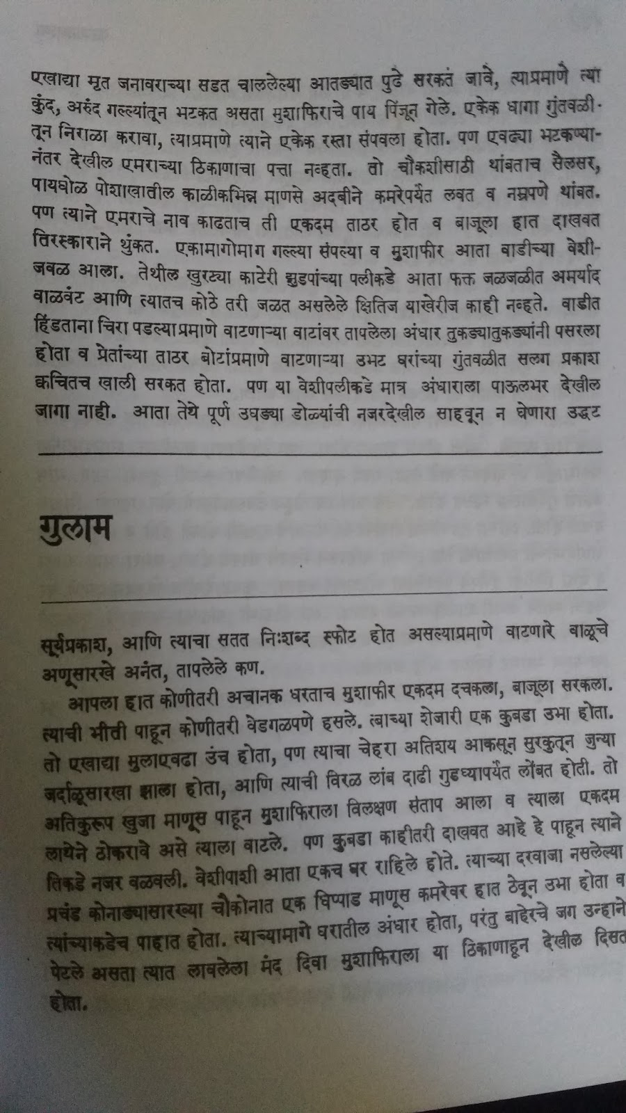 मृत जनावर, कुंद-अरुंद गल्ल्या, खुरटी काटेरी झुडपे, तापलेला अंधार, प्रेताची ताठर बोटे, उद्धट सूर्यप्रकाश, स्फोट, तपलेले कण… अरे अरे अरे काय हे ! सुरुवातीच्या एकाच परिच्छेदात हे असं तर पानंच्या पानं पुस्तक कसं असेल विचार करा.