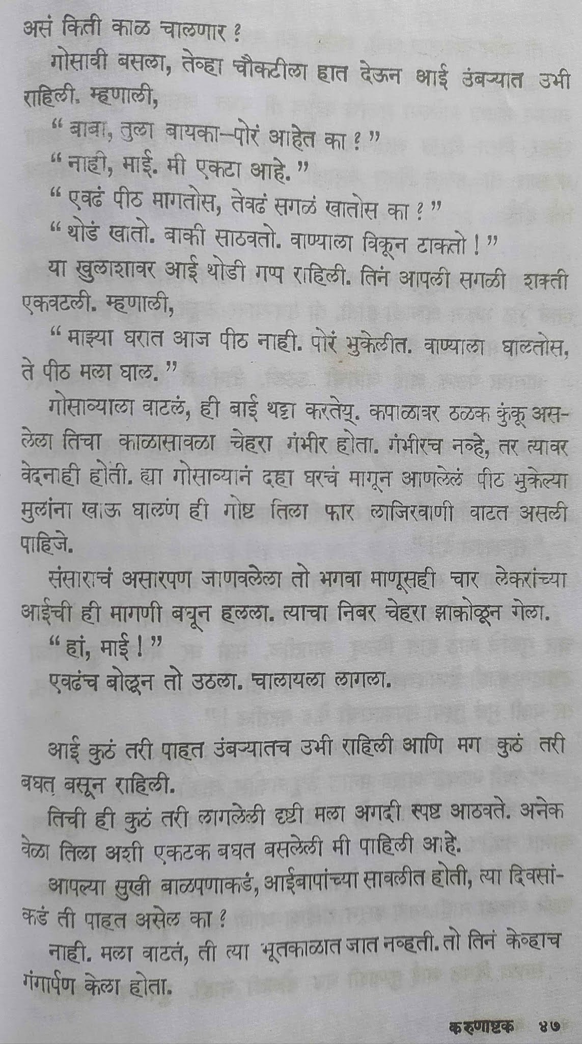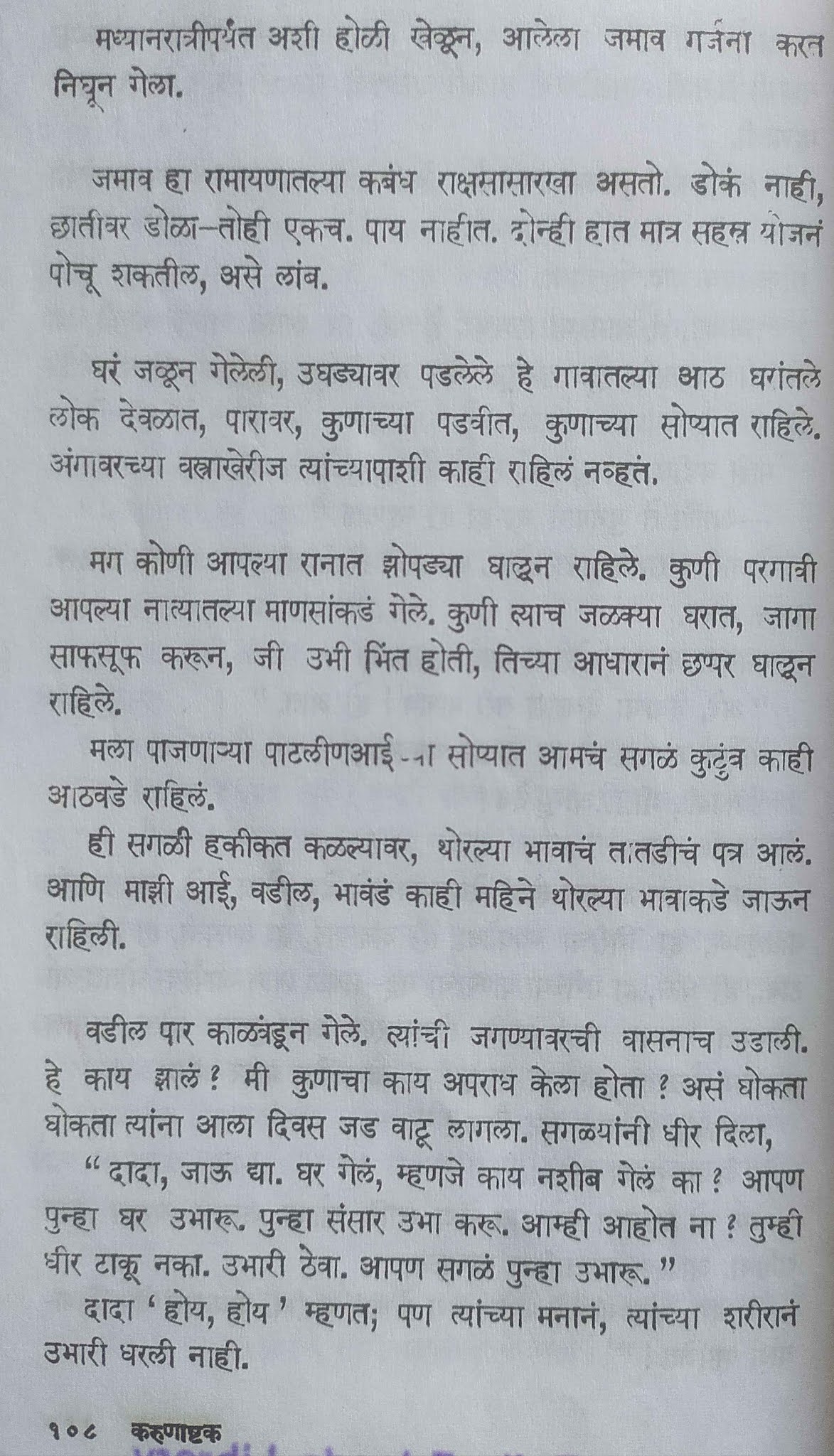 (ज्यांना कोणाला पुस्तकाबद्दल खरं माहिती असेल त्यांनी सांगावं )जर हे खरं असेल तर फारच वाईट आयुष्य लेखकाच्या, कुटुंबाच्या आणि त्यांच्या आईच्या वाट्याला आलं. तरीही ह्या दोन बंधूंनी जे कर्तृत्व दाखवलं त्याचं नवलच वाटेल.पण हे पुस्तक काल्पनिक असेल तर खरंच विषण्ण करणारं पुस्तक आहे. पुस्तक वाचताना कंटाळवाणं होत नाही पण एकसुरी नक्कीच होतं. म्हणजे; सगळ्यांचं सगळं वाईटच होणार आहे हा “अजेंडा” कळाला की असं वाटतं की लेखक असा विचार करत असेल का – “हं आता आता यादीतील पुढचं संकट काय टाकू ? … अरे अजून आत्महत्त्या घेतली नाही. ह्या पात्राला तसं मारतो… ह्या पात्राचं बरं चाललंय असं दाखवलं; ह्याला कर्जबाजारी करतो. … त्याला वेडं करतो …”मला हे वाचताना “पथेर पांचाली” ची आठवण झाली त्याचं परीक्षण लिहिताना सुद्धा मी हेच लिहिलेलं “दुर्दैवाच्या दशावतारांची जंत्री असं कादंबरीचे स्वरूप वाटतं”. जी.एंच्या काजळमाया पुस्तकाबद्दल सुद्धा असंच वाटलेलं.