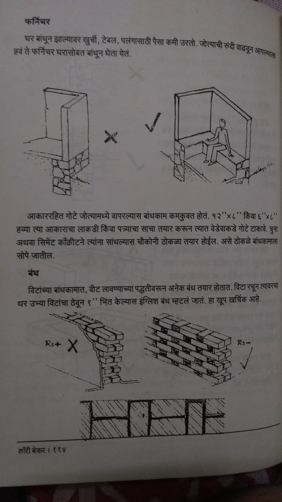 पुस्तकात त्यांनी बांधलेल्या बांधकामाचीही चित्रं आहेत. काही रेखाचित्र(स्केचेस आहेत). बेकर यांनी स्वतः काढलेली रेखाचिरे आणि व्यंगचित्रे आहेत. तरीही अजून चित्रे असावीत असं वाटत राहतं. “वास्तून त्यांनी विटांची अशी रचना केली होती की प्रकाश मंदपणे आत झिरपेल” असं वाक्य असेल तर त्या वास्तूची कल्पना करणं आणि प्रत्यक्ष बघणं यात फरक आहेच. त्यामुळे कितीही फोटो दिले तरी ते कमीच वाटले असते. यूट्यूब वर मला काही व्हिडिओ मिळाले. ते बघताना पुस्तकातली वर्णने अजून मनाला भिडली.