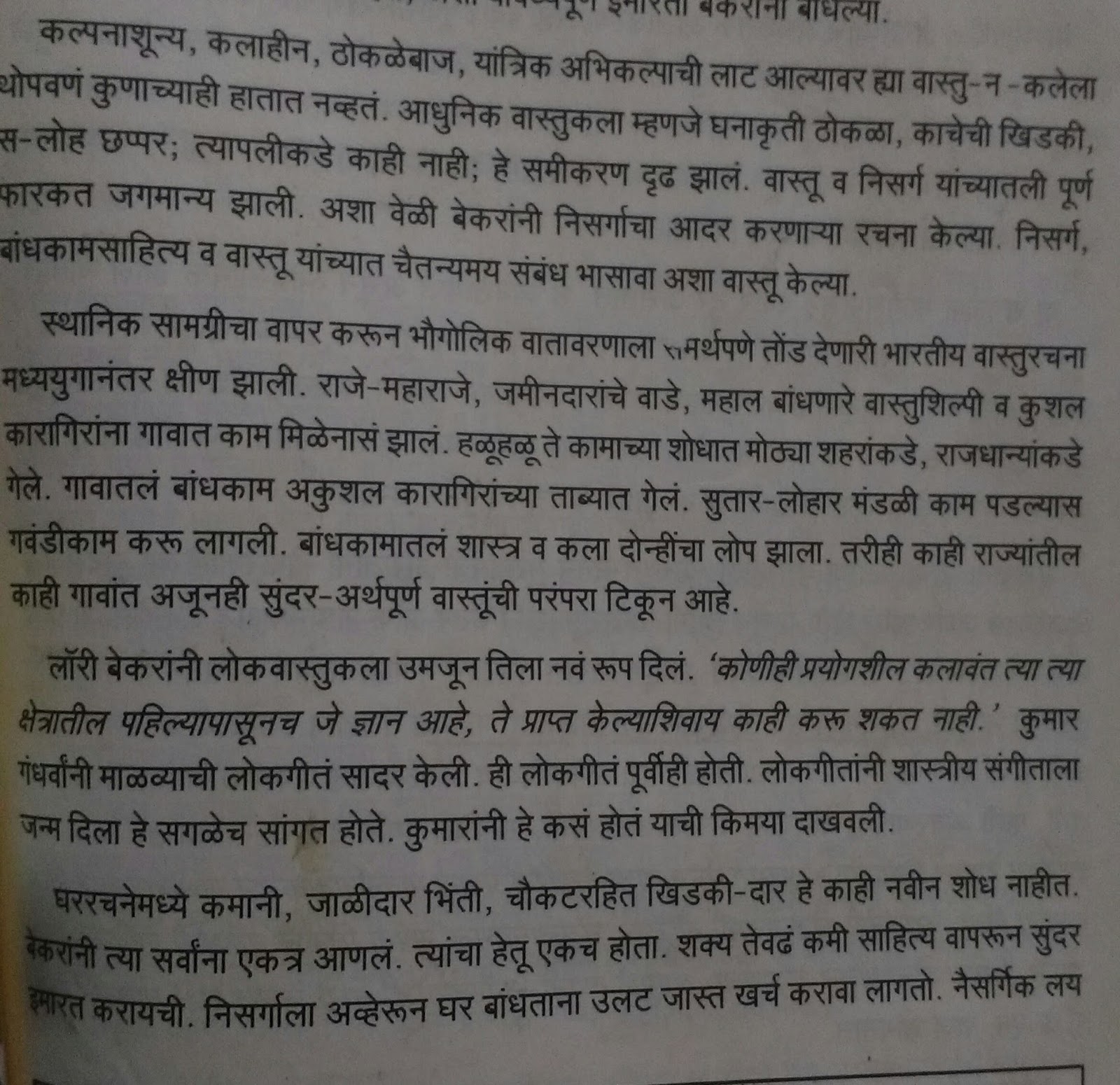 पुस्तक वाचून बेकरांचं सगळं शास्त्र समजणार नाही कारण हे काही त्या विषयावरचं तांत्रिक पुस्तक नाही. पण वास्तूकडे बघण्याचा पर्यावरणपूरक दृष्टिकोन जरी आपल्याला लाभला तरी तरी या पुस्तकाने आपल्याला चांगले प्रगल्भ केले असे म्हणायला हरकत नाही.