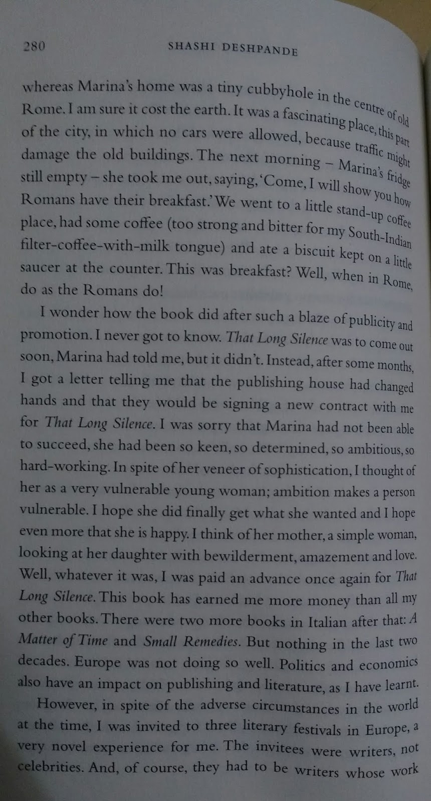 शशी देशपांडे यांचं साहित्य अजून मी काही वाचलं नाही आहे. त्यांचं नावही ऐकलं नव्हतं. पण नवीन पुस्तकांच्या यादीत हे पुस्तक दिसलं. मोठ्या लेखिका आहेत म्हणून हे पुस्तक हाती घेतलं. पण “साहित्य अकादमी”शी वावडं इथेही सुरू राहिलं. हेही पुस्तक आवडलं नाही.