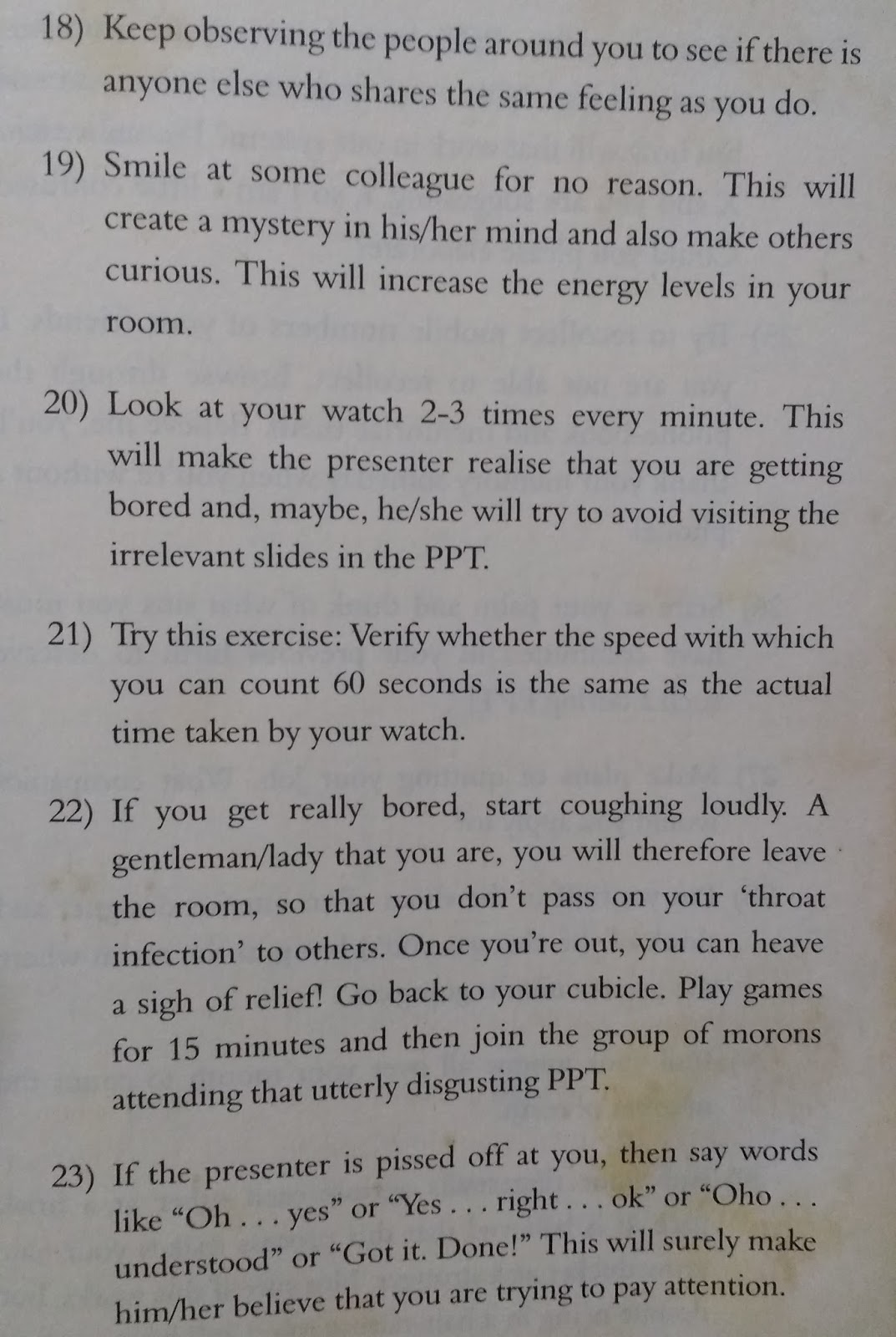 मीटींग, प्रेझेंटेशन्स हा आयटीतला अविभाज्य भाग. लांबलचक चालणाऱ्या मीटींग्स, कंटाळवाणी प्रेझेंटेशन्स यातून तरून जाण्यासाठी कंटाळा घालवायचे आणि आपण लक्ष देतो आहोत असं दाखवायचे विनोदी उपायही सांगितलेत. नमुन्यादाखल हे वाचून बघा :