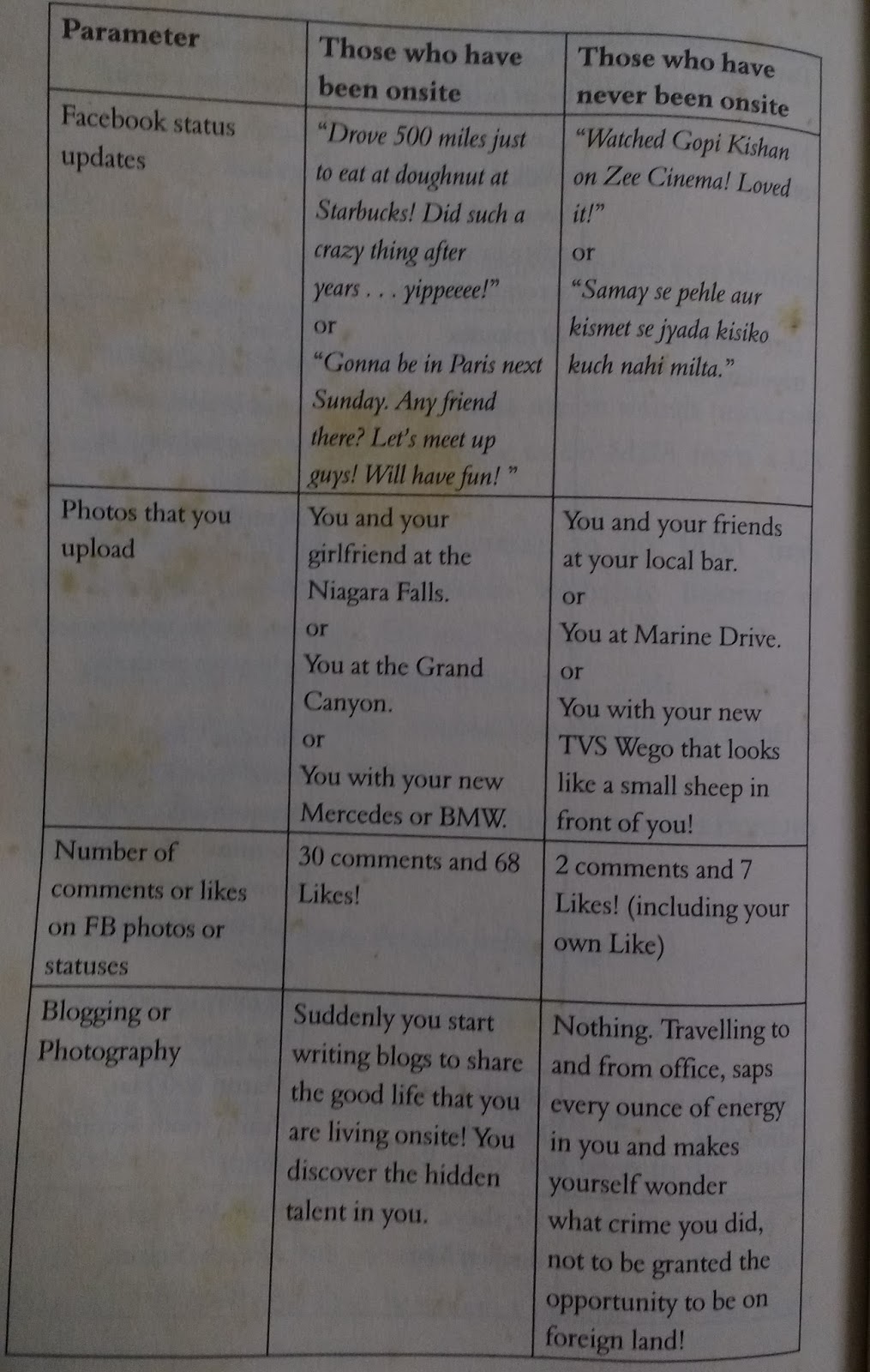 ऑनसाईट – परदेशवारी किंवा दीर्घ मुदतीचा परदेशवास – हा आयटीचा मुख्य आकर्षणबिंदू. पण हे ऑनसाईट मिळणं सोपं नाही महाराजा. त्यामुळे असं ऑनसाईटला जाऊन आल्याने कॉलर टाईट करून वागणारे आणि ऑनसाईट कधी न गेलेले यांच्या वागण्यात कसा बदल दिसेल तेही वाचणं खूप मजेशीर आहे. उदाहरणादखल थोडं :