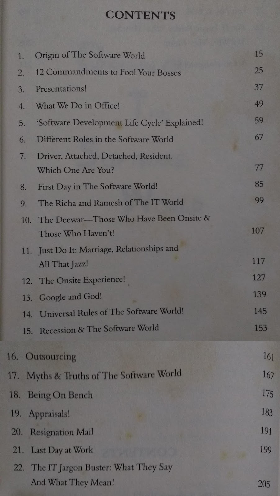 एकूणच काय जर तुम्ही ज्युनिअर लेव्हलचे सॉफ्टवेअर इंजिनिअर असाल किंवा सिनियर लेव्हलचे; यातले बरेच अनुभव तुम्हाला स्वतःला किंवा सहकाऱ्यांना आले असतील, आजुबाजुला दिसत असतील आणि नसतील आले तरी असं होऊ शकतं याची कल्पना तर नक्कीच करता येईल. त्यामुळे पुस्तक वाचताना ते अनुभव आठवून किंवा त्या प्रसंगाची कल्पना करून तुम्ही हसाल हे नक्की. पुस्तक विनोदी आहे, विडंबन स्वरूपातलं आहे; त्याच्याकडे तितक्याच हलक्याफुलक्या शैलीतनं बघूनच वाचलं पाहिजे. मी असं करत नाही, आमच्याकडे कोणी असं वागत नाही, आयटी क्षेत्राला बदनाम करणारं पुस्तक आहे अशी “असहिष्णुता” दाखवू नका. सर्कशीत, जत्रेत “हसरे आरसे” असतात – अंतर्गोल, बहिर्गोल आरसे. त्यात आपण कधी ढेरपोटे दिसतो, कधी चवळीच्या शेंगेसारखे, कधी वेड्यावाकड्या तोंडचे. हे पुस्तक तसं अहे. काही गोष्टी नेहमीपेक्षा मोठ्या दिसतील काही काही नेहमीपेक्षा खूप लहान. आयटितल्या नेहमीच्या अनुभवांचा मसावि आणि वाईट अनुभवांचा लसावि.