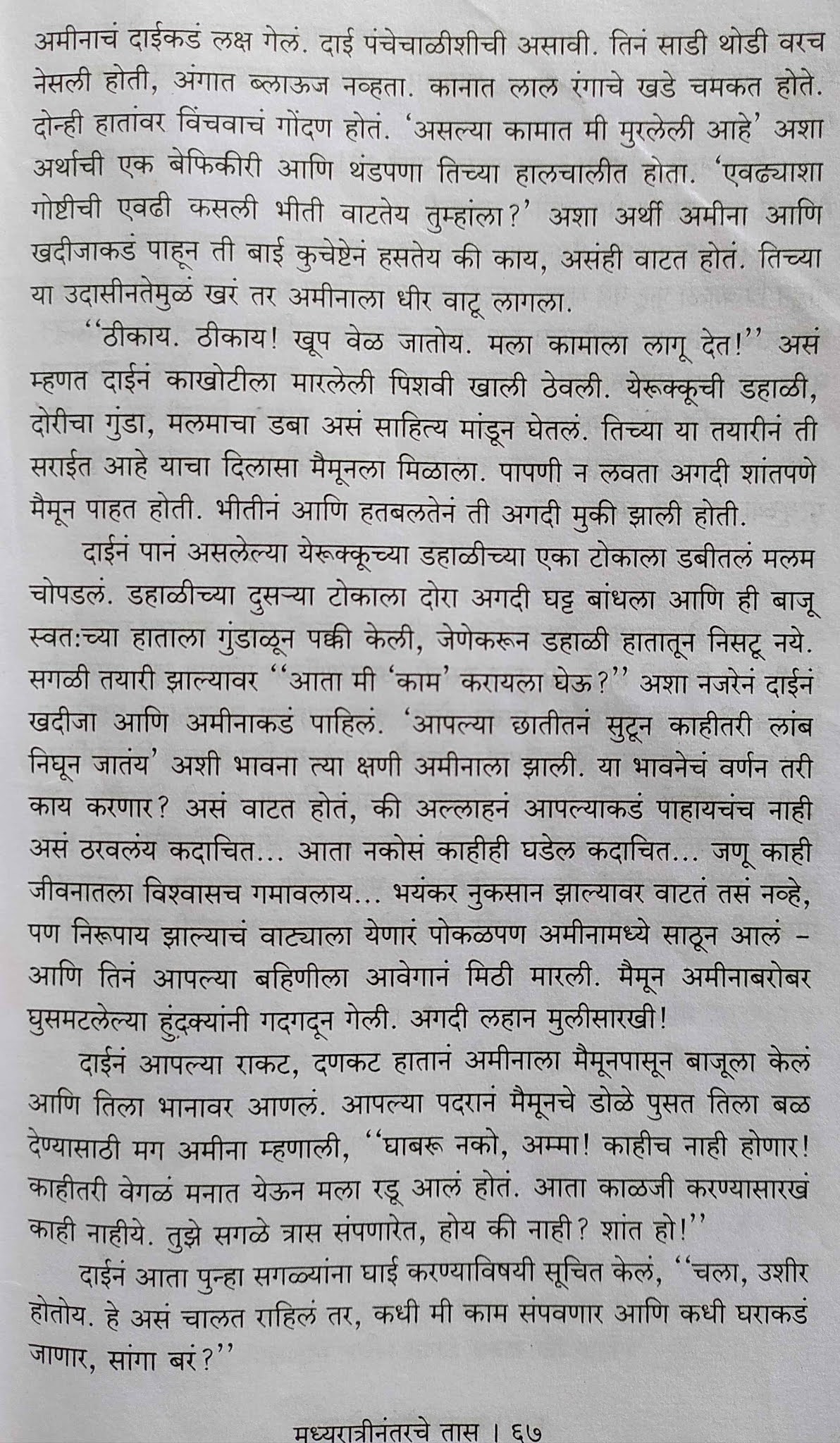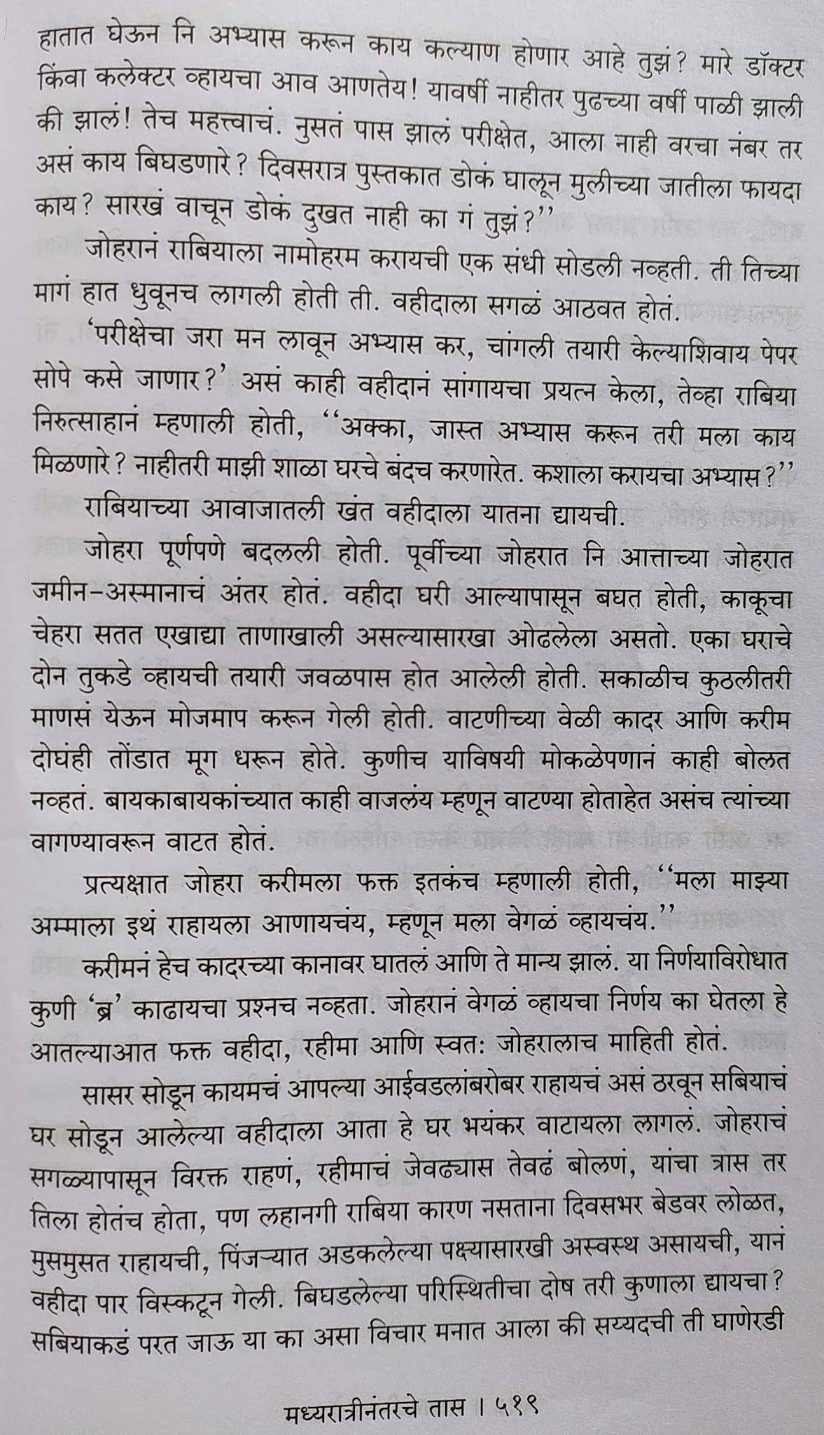 पुस्तक ५६१ पानी आहे. प्रसंगांमगून प्रसंग येत असतात. पण ह्यात कथासूत्र नसल्यामुळे एक विस्कळीतपणा जाणवतो. पुढे काय घडतंय हे वाचायची उत्सुकता जाणवत नाही. जरा रेटत रेटतच वाचावं लागतं. जास्तीत जास्त प्रकारच्या समस्या मांडता यावयात ह्यासाठी 3-4 कुटुंबात सगळ्या समस्या दाखवल्या आहेत. एकही सरळमार्गी कुटुंब नाही, एकही व्यक्ती शुद्ध चारित्र्याची वाटत नाही; हे जरा अतीच होतं. पुस्तक बरंच लांबलंय त्यामुळे काही तपशील गाळून पुढे वाचावं लागतं नाहीतर कंटाळा येतो.